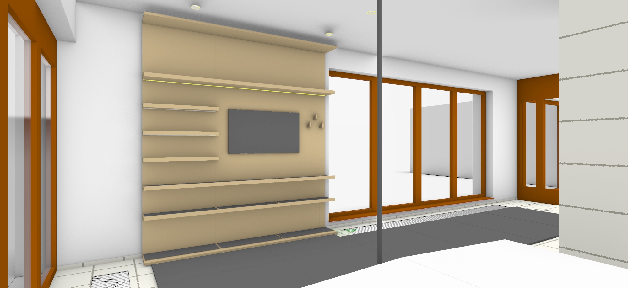 visualization of home fitness do not change any proportion the window frames brown wood new wall panel with shelves for fitness staff oak matt ceiling stright next to the panel oak creating c shape form of the wall panel put fitness staff on that oak panel wall on the right side put some small kettlebels on lower shelves 2 towels above 2 jogamats rolled on shorter shelves next to the tv hang 1 jumping rope on hang on the right side of the flat tv make ambient light there is soft led lights under the shelves on that wall oak panel and 4 round light on the oak ceiling do not put anything on floor or windows