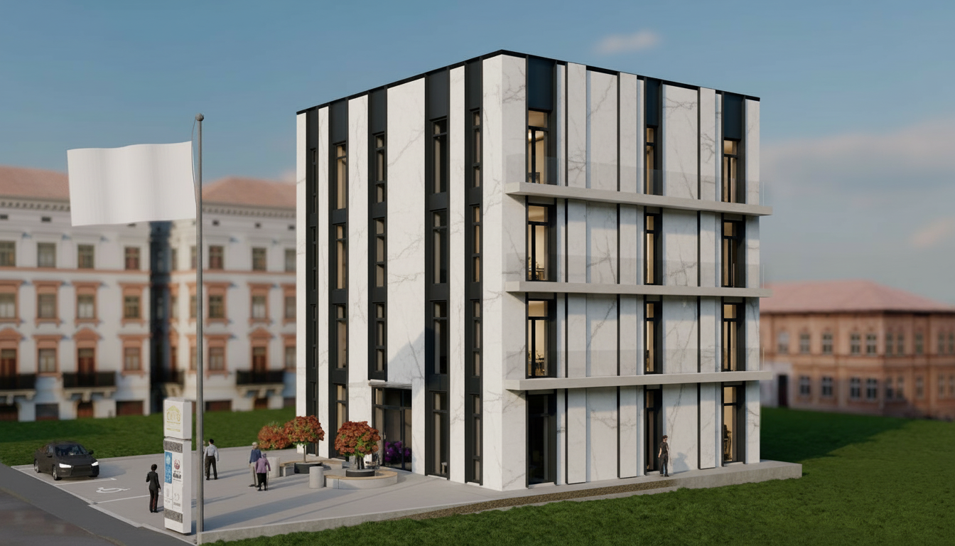 high detail architectural photograph of the specific modern house in image 0 png viewed from the same angle the grey timber cladding on the right must feature deep intricate and weathered wood grain texture with pronounced vertical depth the central natural stone chimney stack must have profound textural relief with individually articulated rough hewn flagstones showing deep shadows and varied colorations the dark grey roof tiles must be highly detailed individual tiles with clear depth visible interlocking seams and subtle imperfections include precisely rendered dark grey gutters and integrated vertical downpipes following the eave lines all windows are highly transparent showing subtle deeply shadowed interiors the foreground flowering bushes and tall grasses must have lush hyper realistic intricate foliage with fine detail the lawn is dense and textural the surrounding context buildings remain simple geometric blocks lighting is a soft warm natural daylight from a sun subtly veiled by light wispy scattered clouds in a bright sky the atmosphere is serene and photorealistic highly detailed textures
