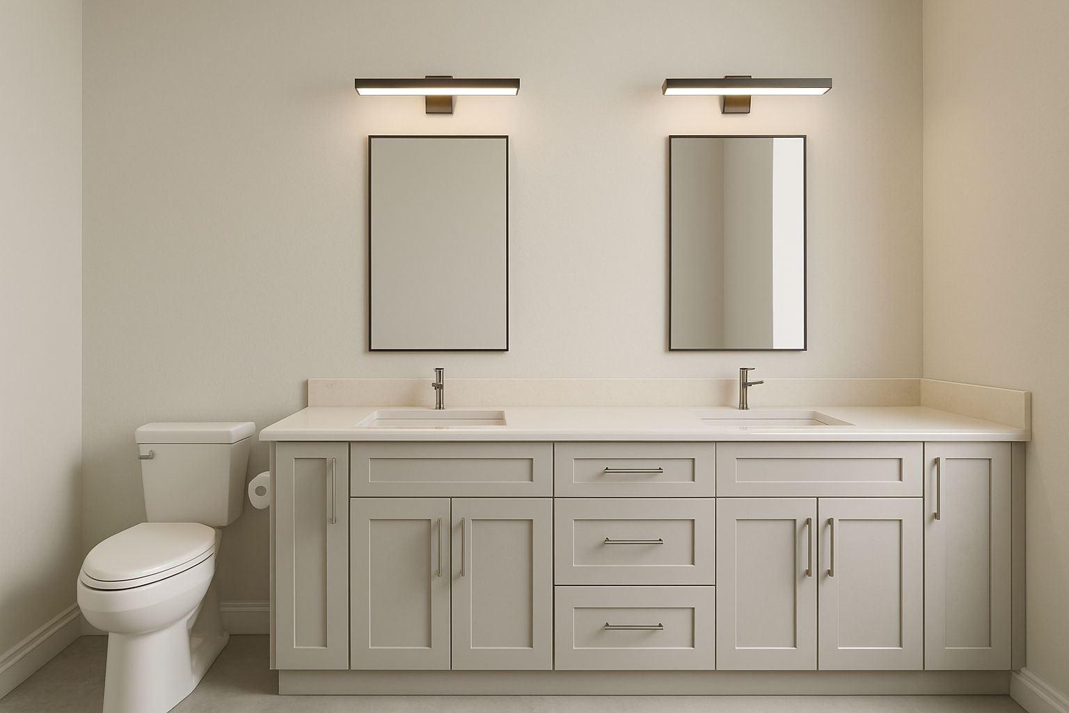 rustic farmhouse with a modern twist featuring a white board and batten exterior use soft grey for the roof and window trims include large windows with black frames surroundings should be a lush green landscape with vibrant flowers in the garden soft warm lighting gives a cozy evening atmosphere sky should be a gradient of orange and pink indicating a serene sunset there is a 3 car garage in the front left and a 1 car garage in the front right make sure to add that depth architecture