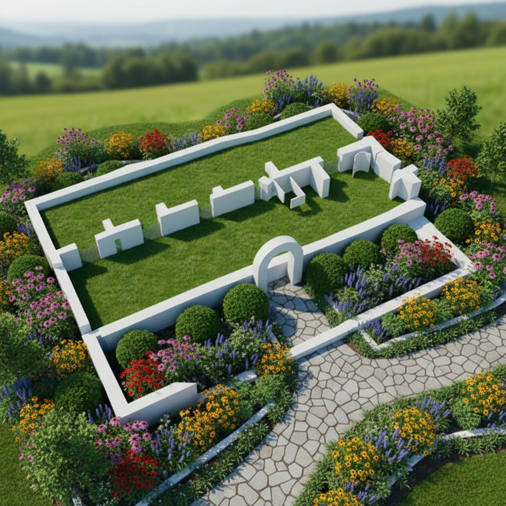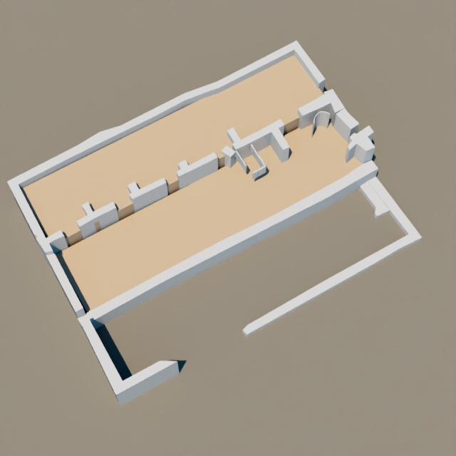 photorealistic archaeological excavation site weathered irregular limestone block walls collapsed ancient masonry compacted excavated earth floor erosion soil variation excavation marks natural mediterranean sunlight aerial isometric photograph