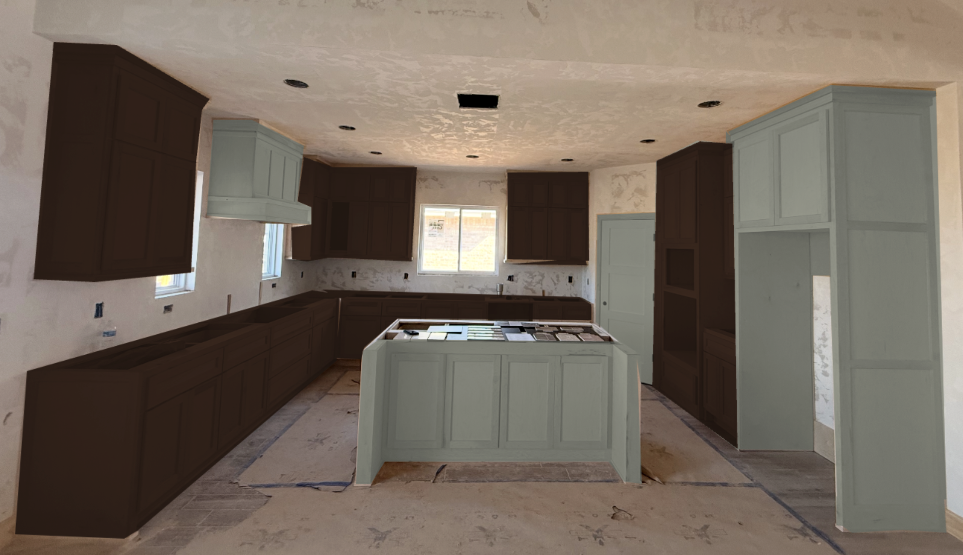 darken the stain on the brown cabinets and add a light oak flooring with no yellow or golden tones