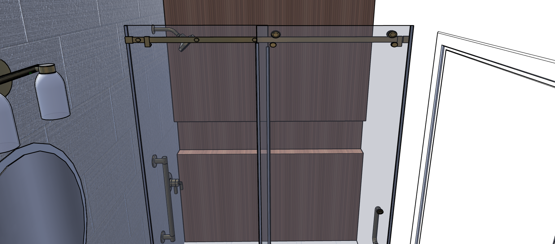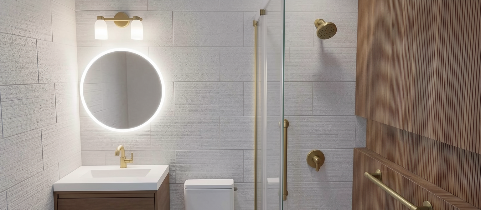 preserve all existing textures geometry materials colors and proportions overall scene is evenly brightened using neutral 3500k lighting only do not add highlights glow reflections or new light sources lighting comes only from the vanity light with white semi transparent scones 3500k and mirror backlighting the mirror has a soft white backlit halo 3500k evenly diffused there is no sunlight nor any light source other than the vanity light and backlit mirror the shower head and all shower fixtures are not light sources and emit no light mirror has a white semi transparent glass edge all metal hardware and accessories are brushed brass the back wall and the left side wall are unicolor with 3d horizontal rough chiseled texture the backwall has very thin 3d vertical wood slat tiles in a dark walnut tone with very little variation