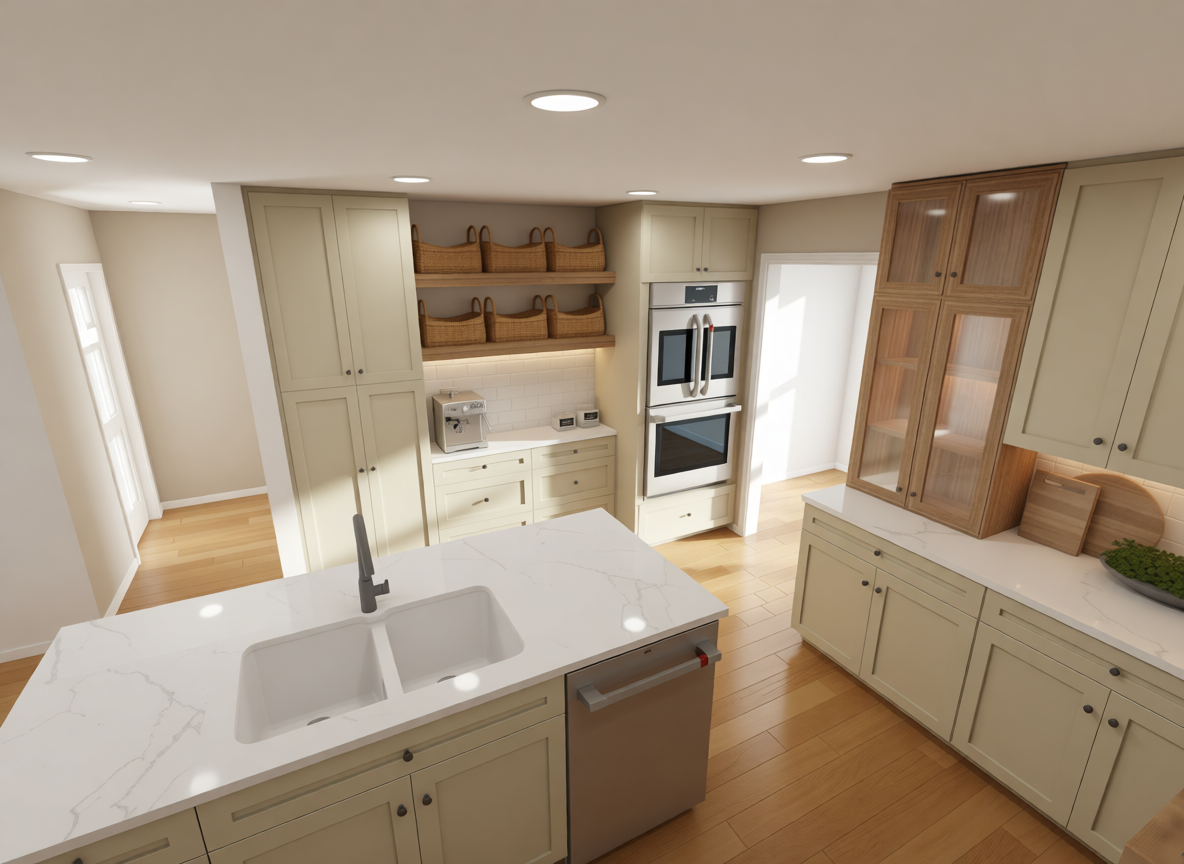 ultra realistic interior render of a traditional transitional kitchen matching the reference image exactly in layout proportions materials colors cabinetry design and lighting with no design changes the camera is positioned at eye level using a normal focal length 35 50mm with straight vertical lines no distortion and realistic perspective the kitchen has a u shaped layout with full height millwork cabinetry on the left wall a working wall with window on the right and a centered island aligned precisely with the cabinetry and flooring all cabinetry is painted in a soft sage green with a gray forward undertone slightly desaturated and muted leaning subtly toward gray while clearly retaining a green identity the color has no yellow olive mint or blue cast and reads as a calm sophisticated green gray finish is matte to soft eggshell never glossy cabinet doors are classic shaker style with refined proportions consistent reveals and crisp edges upper cabinets extend fully to the ceiling with clean crown detail hardware throughout is brushed warm brass with a muted satin finish not reflective or polished on the left wall the kitchen features two fully integrated panel ready refrigerators concealed behind custom millwork panels that match the cabinetry exactly in color door style and hardware the refrigerator panels align seamlessly with adjacent tall cabinets creating a continuous built in millwork appearance with no visible appliance fronts the central island base is constructed in natural white oak with visible recessed panel detailing on the end panels and front faces the oak tone is light to medium neutral and desaturated european white oak style with no red orange or honey undertones finished in matte the hardwood flooring matches the island oak exactly in tone grain and finish wide plank matte running continuously through the space island and perimeter countertops are light stone or quartz with a soft warm white base and very subtle low contrast veining the same material continues as a clean full height backsplash up to the underside of the upper cabinets cabinet interiors and appliances remain concealed and minimal the right wall includes full height upper cabinets in the same green gray tone a window centered above the counter and a light neutral roman shade with subtle pattern and soft folds bar stools at the island have slim black metal frames and upholstered seats in a muted green fabric slightly deeper than the cabinetry with a soft matte textile texture the ceiling is painted pure white and fitted with evenly spaced recessed spot lights all illuminated emitting soft warm white light at approximately 3000k two pendant lights are centered over the island featuring warm brass stems and pleated white fabric shades the pendants are turned on producing a gentle diffused glow with visible internal illumination walls are warm white with clean trim and a green door or pantry door is visible in the background slightly darker than the cabinetry for depth lighting is balanced between recessed lighting pendant lighting and natural daylight producing soft realistic shadows accurate reflections and natural contrast the render style is high end photorealistic architectural visualization with realistic materials accurate scale clean geometry and no stylization do not alter layout cabinetry configuration colors materials proportions or add decorative elements