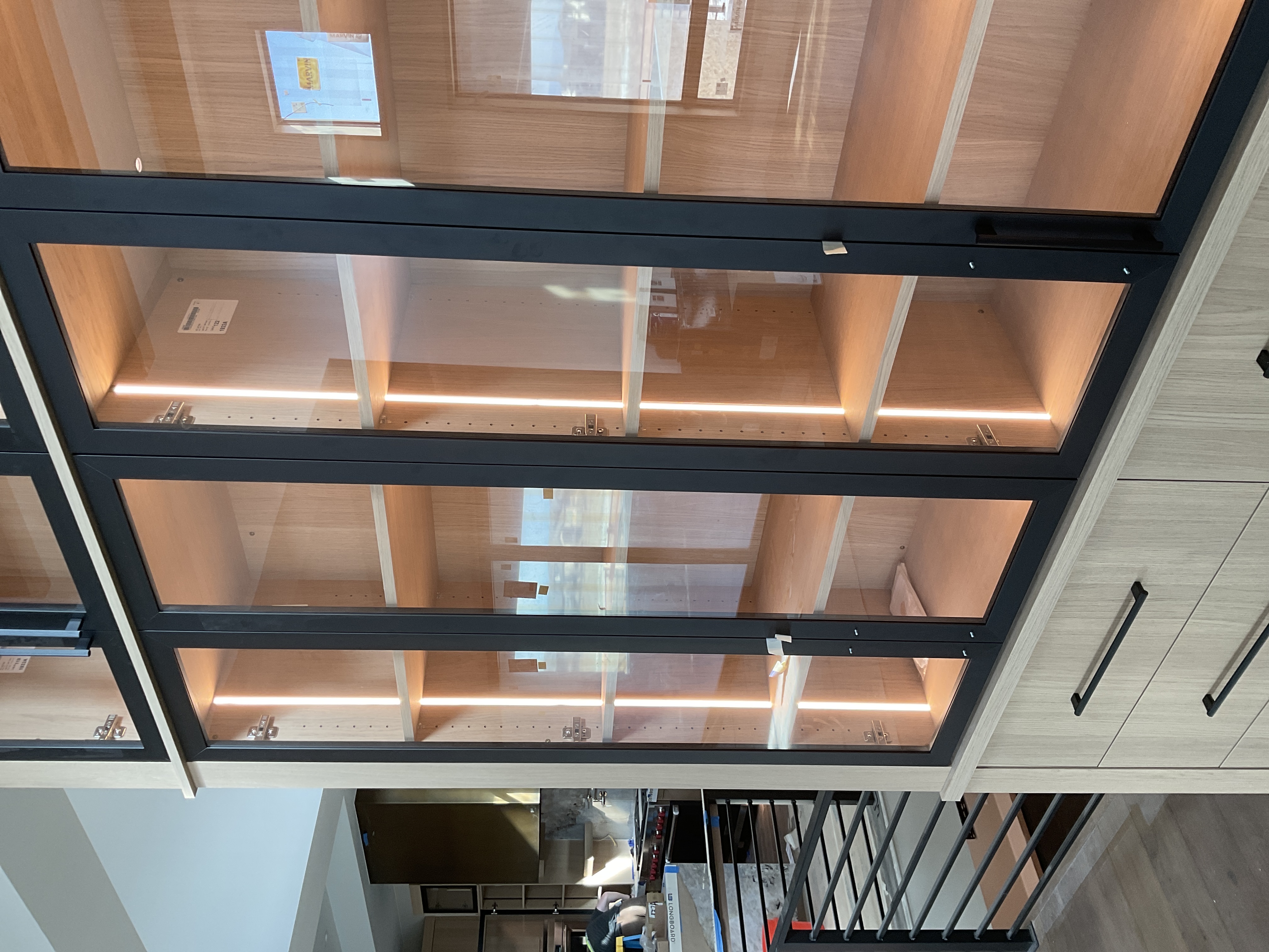 do not change the cabinets in any way preserve the exact cabinet colors materials finishes dimensions door and drawer styles hardware spacing alignment and all geometry exactly as shown do not alter the countertop shape backsplash appliances flooring lighting fixtures or wall structure only remove the construction materials clutter and mess from the scene clean the room and make it look finished and staged add a few simple tasteful home accessories appropriate for the style of the space but do not add or remove any furniture windows or architectural elements maintain the original lighting direction and realism enhance clarity and polish the photo while keeping the cabinetry and room design completely unchanged do not alter the lighting to keep the cabinet colors as they are in the image stage the shelves in the glass cabinet for a luxurious modern kitchen add cabinet pulls to the back doors on the bottom where the screws are remove the stickers on the inside of the cabinets remove the sticker on the glass door on the right