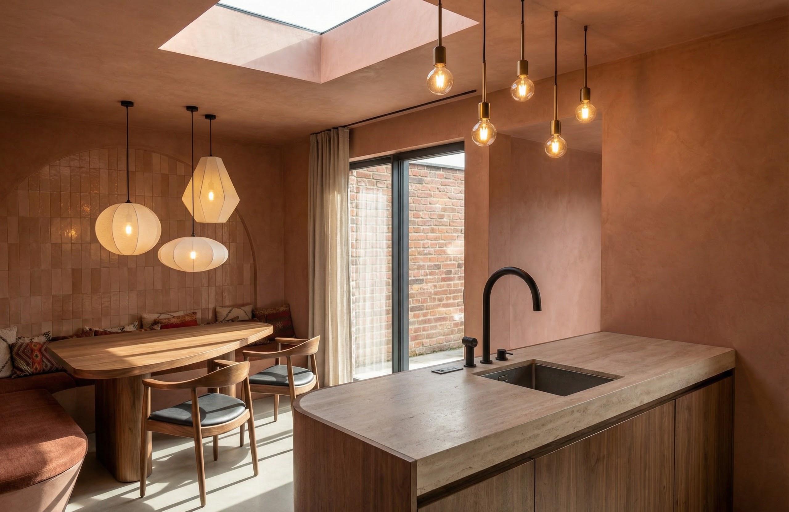 create a realistic render showing a row of red brick and georgian style houses nestled behind a hedgerow the weather should depict a calm sunny day with a blue sky and clouds