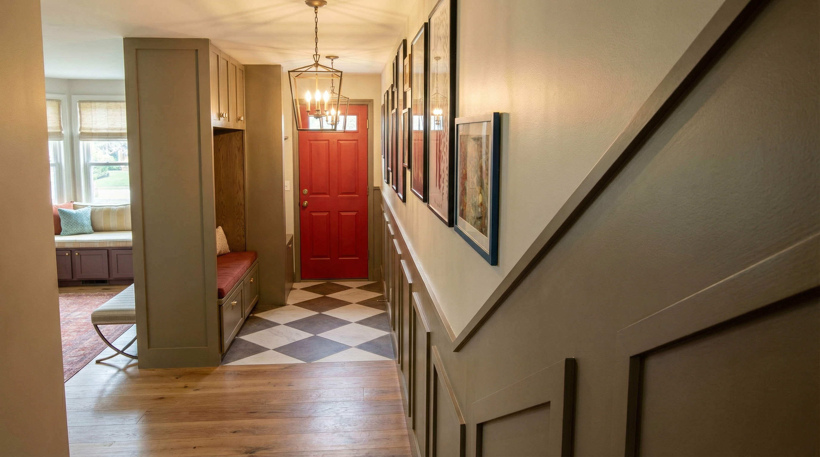keep the wooden hues to original as the uploaded image keep accurate keep everything the same exactly the paneling on the wall is preference red by farrow and ball and the welsh cabinet on the faaar back is drab by farrow and ball be accurate