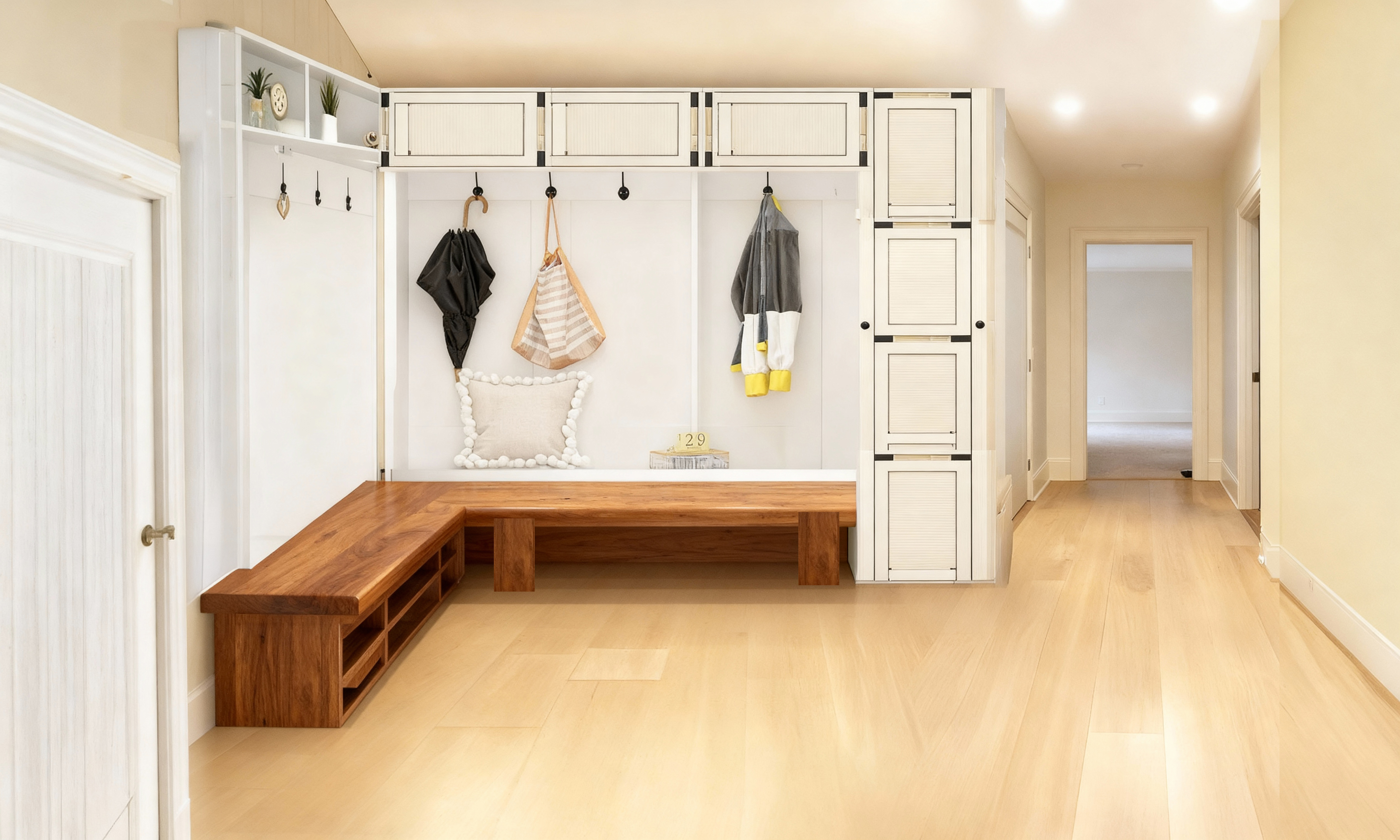 convert to realist photo mud room with bench and storage shelfs on two walls