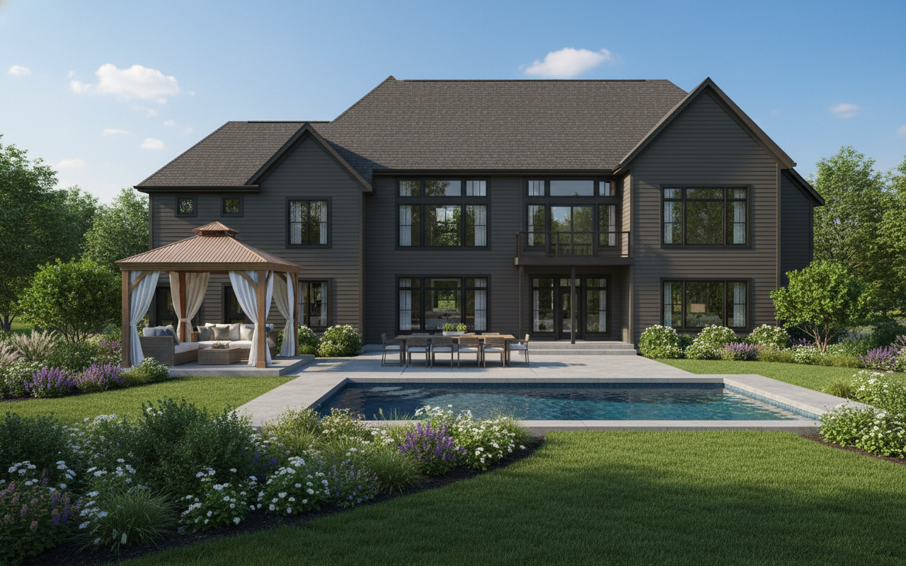 add a riverpools x36 model pool cedar gazebo with curtains add outdoor furniture make the siding black paint colored no stone or brick on the house black windows do not change the layout add landscaping zoom out far to show landscaping and house make the deck all brushed concrete add dining table and chairs add lounge chairs and a white umbrella no steps put the gazebo to the left make it look fancy