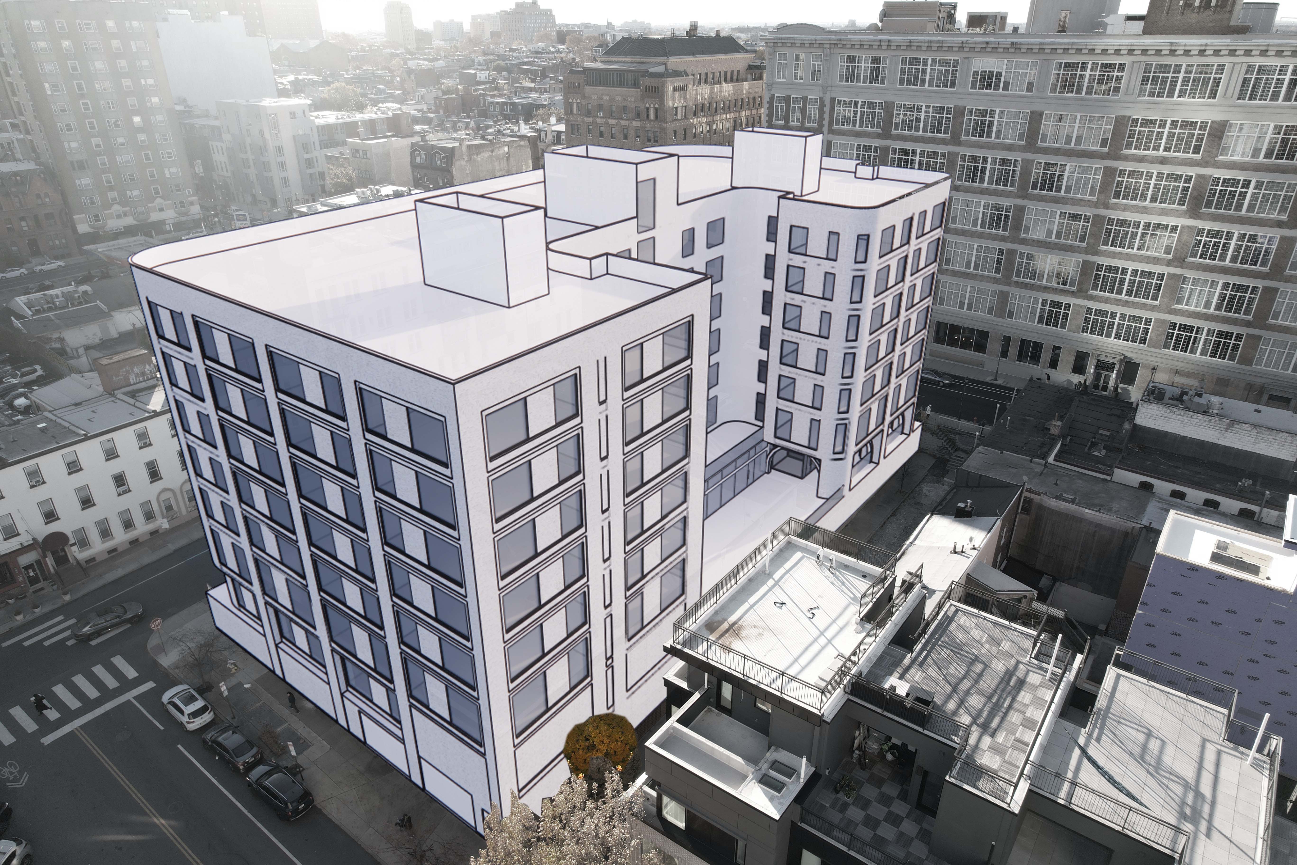produce rendering of a warm gray brick building with contemporary brick detailing all lintels and sills should be a solider course warm gray brick windows should be black color industrial style provide curtain wall glazing at the ground level where the building curves the roof should be a green sedum roof material transition to vertical white siding at interior courtyard roof penthouses to also be vertical white siding populate scene with people cars lighting trees