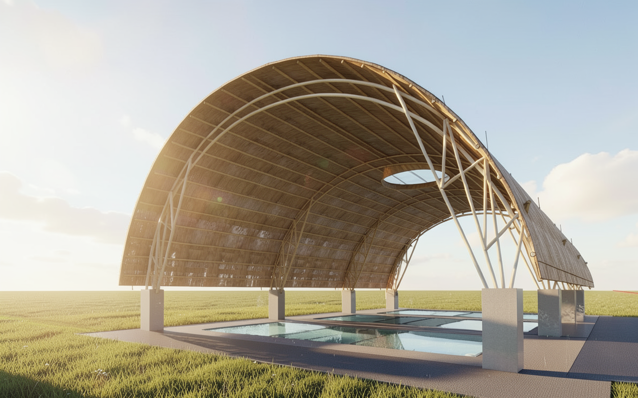 generate a waterfront park and picnic area with mega pool with leisure swimmers the pool is surrounded by a boardwalk