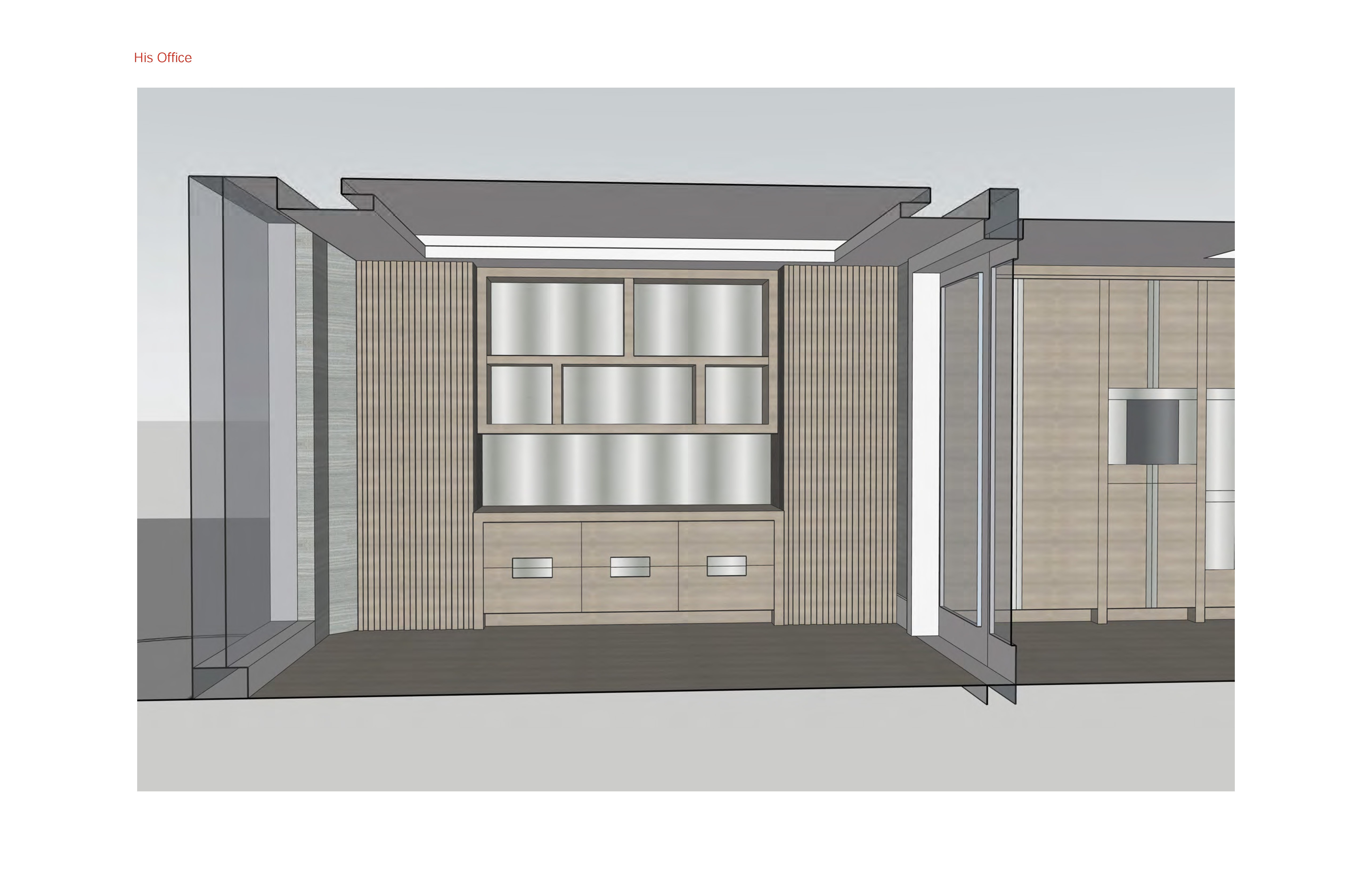 modern minimalist office interior central focus on elegant shelving with frosted glass panels and sleek wooden cabinets wood paneling in light ash tone floor same as paneling walls in cool grey ceiling with soft recessed lighting large glass windows on the sides creating a spacious and airy atmosphere color palette includes soft neutrals and natural textures ambient lighting for a calm and sophisticated atmosphere