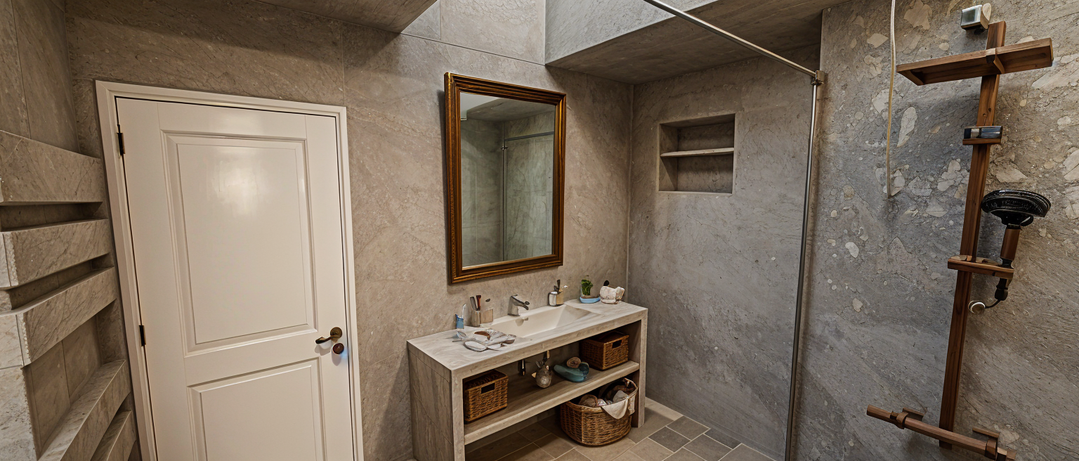 interior shot le sol est en tommettes couleur brique forme hexagonale seche serviette blanc et mur b ton cir e beige
