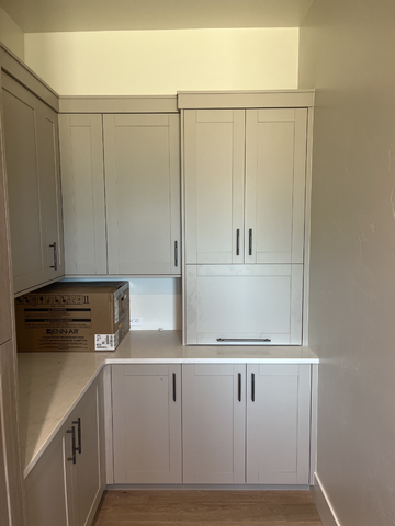 do not change the cabinets in any way preserve the exact cabinet colors materials finishes dimensions door and drawer styles hardware spacing alignment and all geometry exactly as shown do not alter the countertop shape backsplash appliances flooring lighting fixtures or wall structure only remove the construction materials clutter and mess from the scene clean the room and make it look finished and staged add a few simple tasteful home accessories appropriate for the style of the space but do not add or remove any furniture windows or architectural elements maintain the original lighting direction and realism enhance clarity and polish the photo while keeping the cabinetry and room design completely unchanged do not alter the lighting to keep the cabinet colors as they are in the image add undercabinet lighting stage the countertop for a pantry