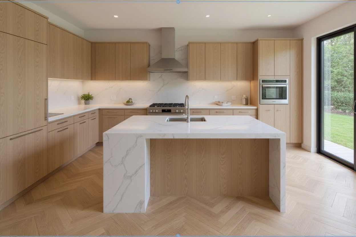 using attached drawing to render the kitchen add hood on top of range no sinks white wall lighter wood tone waterfall at short side of island go back to previous show outdoor at glass go back to previous use this rending take out sink show out door space at the far end glass door