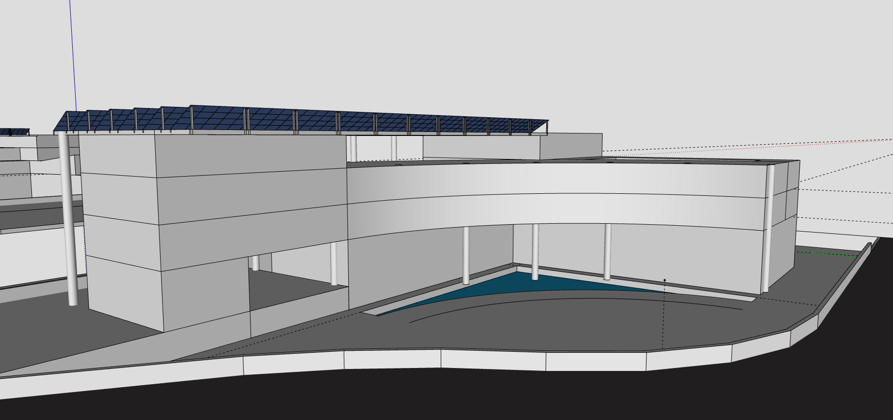 modernist exterior shot exterior view of an office building bottom of the image is the road the facade is primarily made of glass the terraces have vegetation the bottom floor on the right wing is a bus display the compound wall also has vegetation but the building is still visible there is a pond in the courtyard which also has an amphitheatre the roof has solar panels on a frame architecture