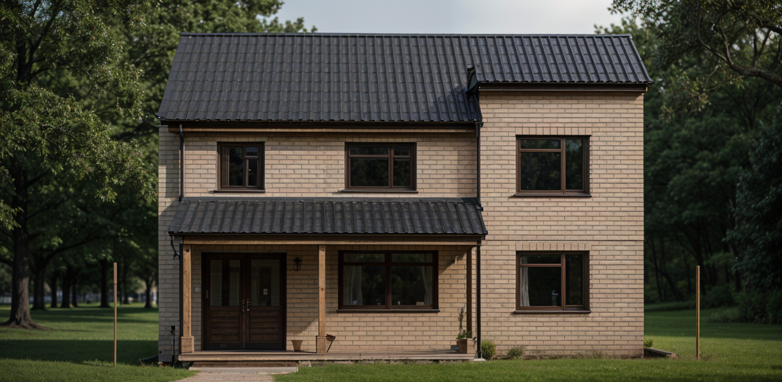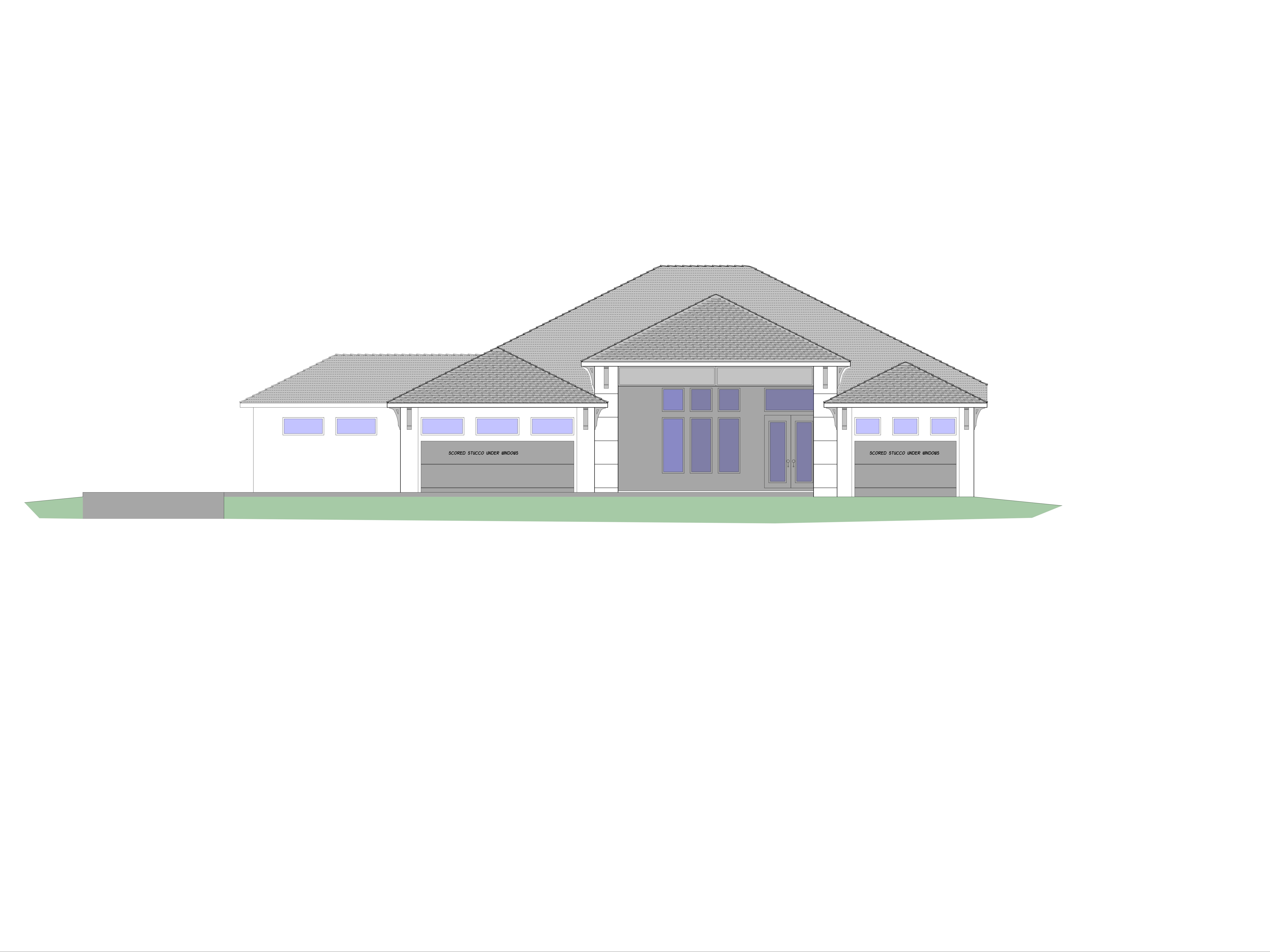 show a dark grey flat tile roof dark grey corbels and horizonal wood shutter suspended below the entry roofline 3 equal transom windows picture framed with 4 stucco banding and dark grey scored horizonal banded stucco below on each side of the home dark grey dappled paver sidewalk from entry doors sweeping to left side of home no garage doors tropical landscape with blue sky and fair weather clouds also show the left hand extension of home that sets back beyond the front main house is painted white there are no bahama shutters on the right side of home