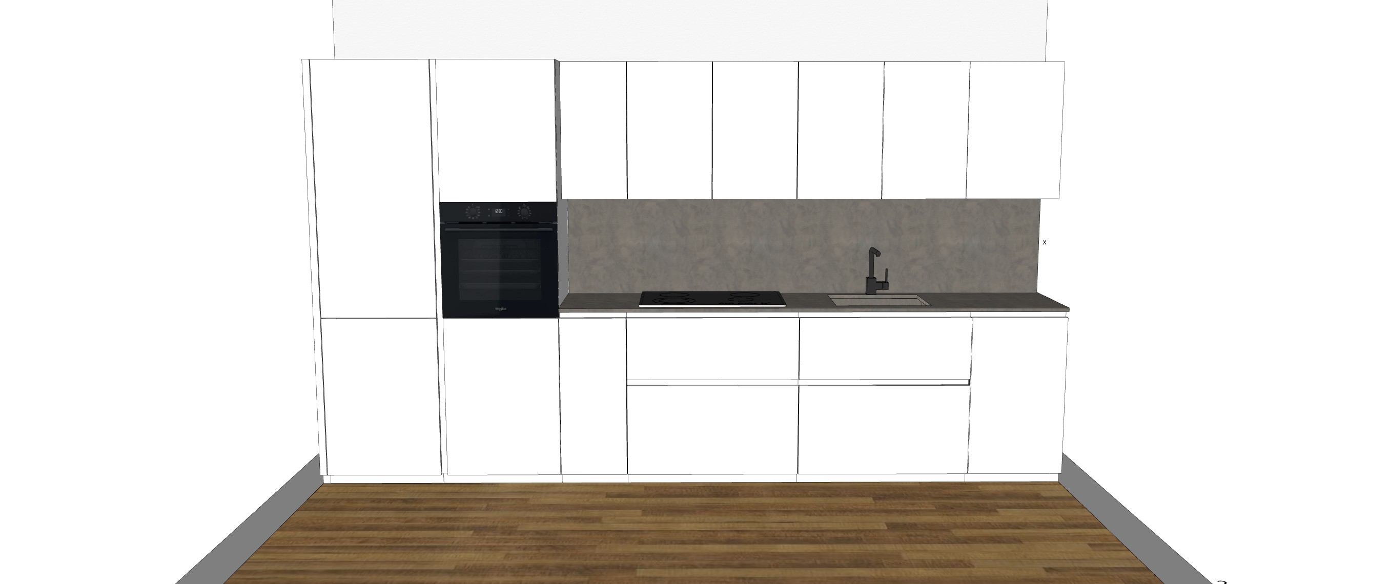 photorealistic render of a modern linear kitchen strictly preserving the original geometry layout proportions and exact material colors from the model important do not modify layout proportions or materials keep all colors exactly as in the original design no reinterpretation no color shift do not warm up or cool down the materials maintain neutral and faithful color rendering materials base units and wall units in matte white lacquer pure neutral white no warm or cold tint tall unit in the same matte white lacquer countertop in grey hpl exact tone as in the model matte finish backsplash matching the model neutral and consistent floor in natural wood parquet keep the exact tone and color variation from the original image lighting neutral natural daylight around 4000k to preserve true colors integrated led strip under wall units illuminating the countertop neutral white light 3500 4000k soft and even illumination no color cast avoid golden hour or warm cinematic lighting objects minimal and neutral add a few subtle objects on the countertop wooden cutting board neutral tone simple ceramic jar white or beige small plant with natural green tones objects must not alter or dominate the color balance environment clean minimal and realistic space no added elements that change perception of materials soft ambient occlusion for depth realism details preserve true whites without overexposure maintain texture visibility without altering color no artificial contrast or saturation boost accurate material response matte surfaces stay matte camera frontal view aligned with the kitchen lens 30 35mm camera height approx 150 160 cm straight vertical lines quality ultra realistic render high detail pbr materials global illumination ray tracing soft shadows negative prompt warm lighting golden tones color grading oversaturated colors high contrast filters glossy surfaces plastic look modified colors or materialscolor accuracy priority preserve original albedo values no color grading