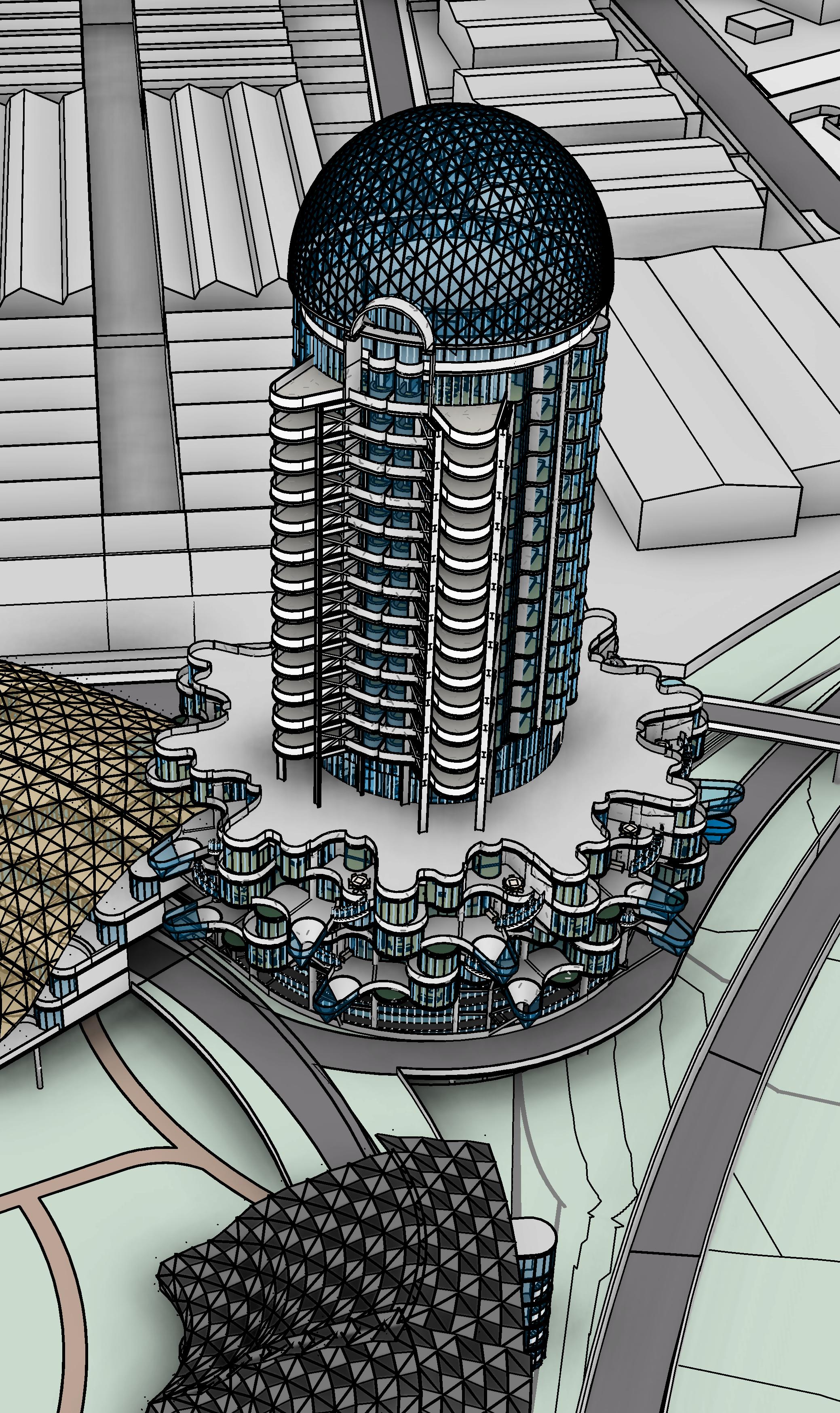 sunny daytime render of a residential tower with a real city background preserve the geometry of the drawing make interior light visible from within the tower
