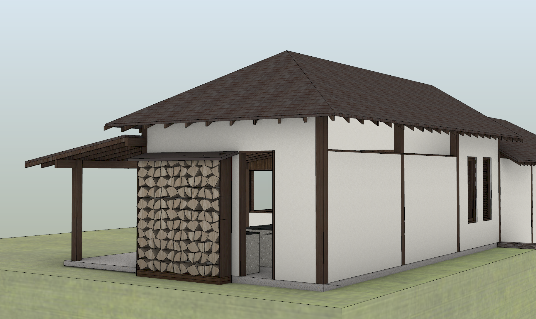 ultra realistic photograph of a side of a building with an open storage of wooden logs the sky is blue with clouds and the distant scenery is tropical jungle trees and plants the green in the foreground is lvery low grass the walls of the building are off white textured plaster