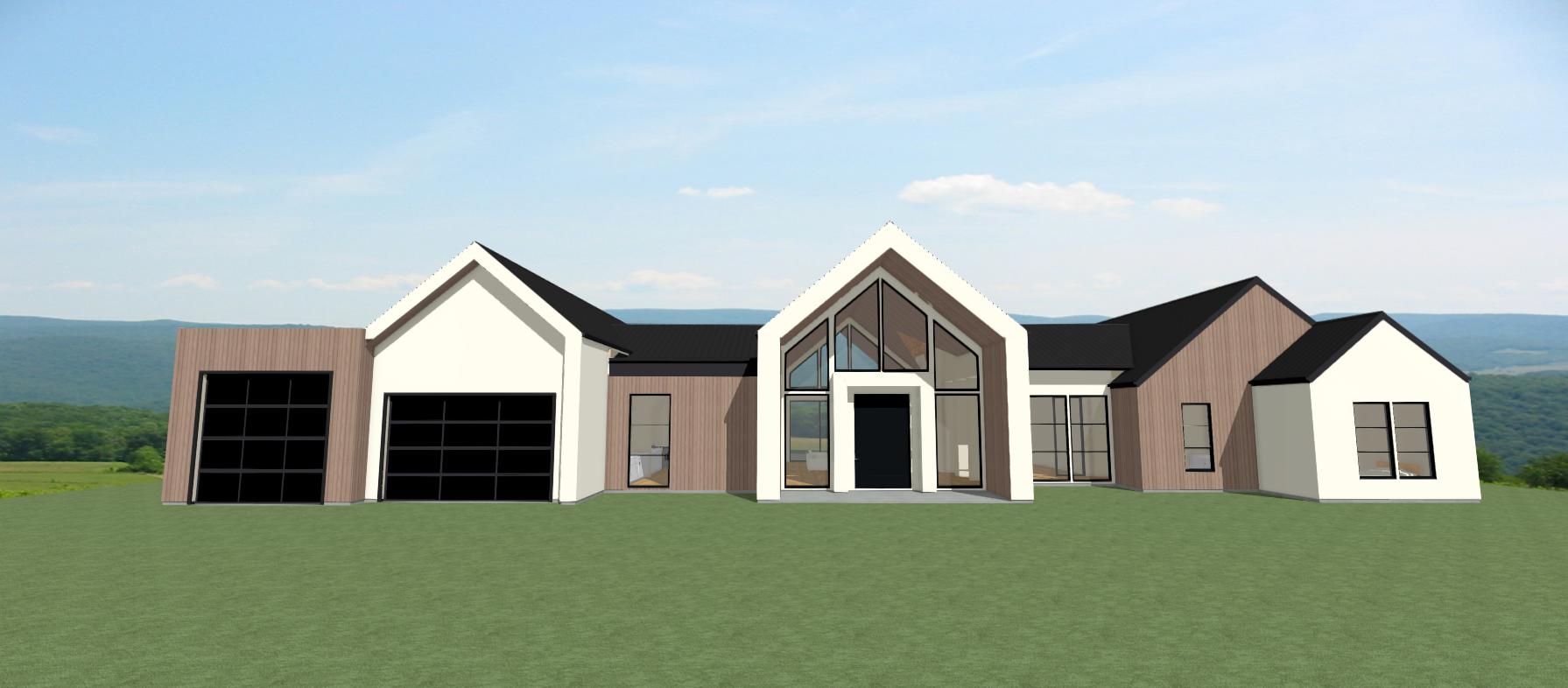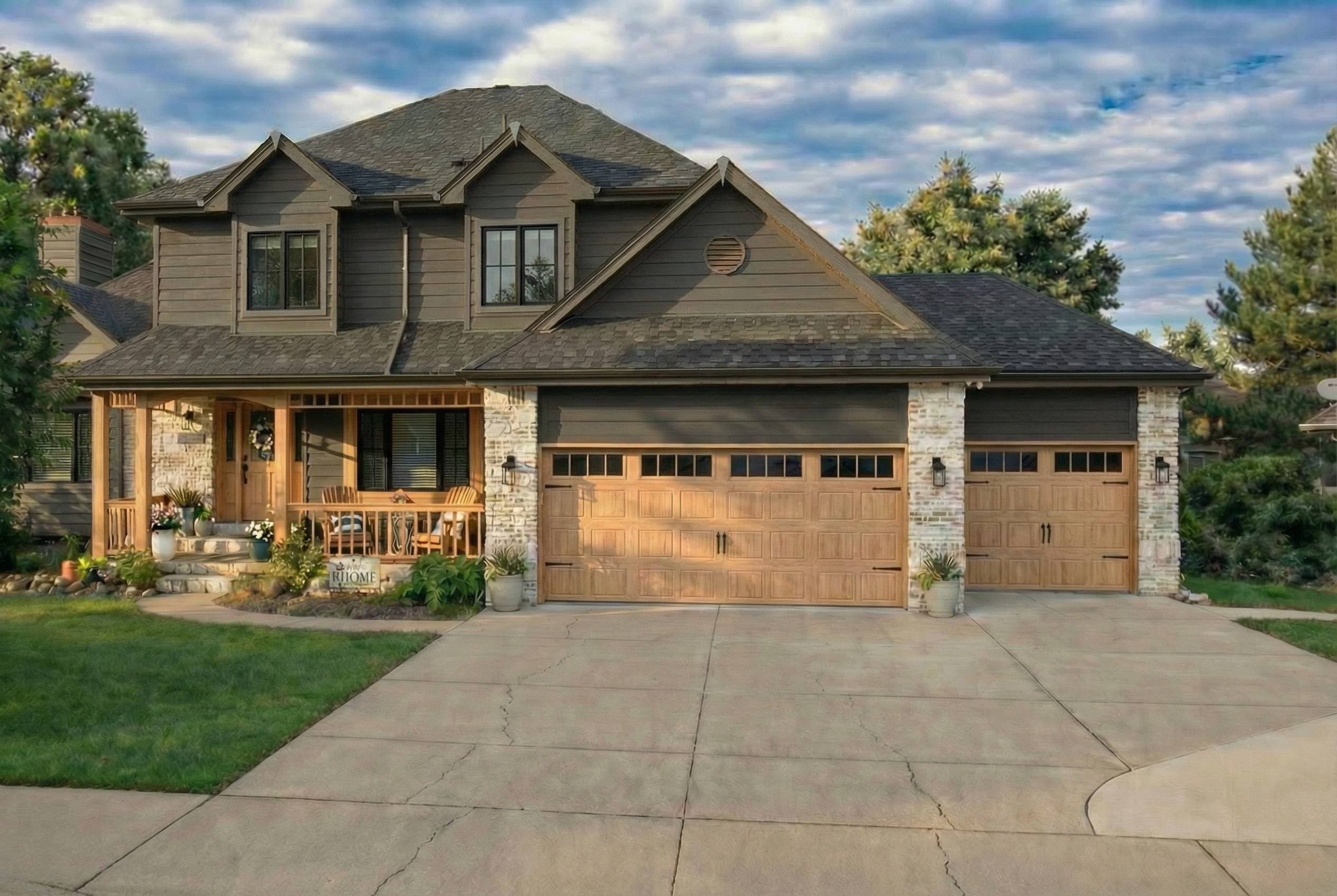 replace cedar with darker vertical boards add landscaping evergreen trees concrete driveway for both garages