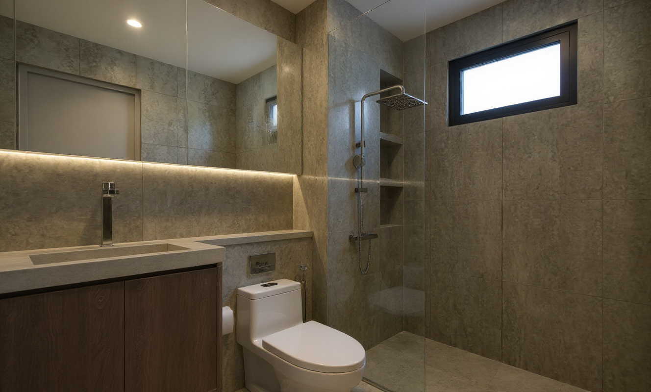 convert to a realistic render add led lights underneath floating shelves wood tone is light white wood oak ceiling is high ceiling about 18