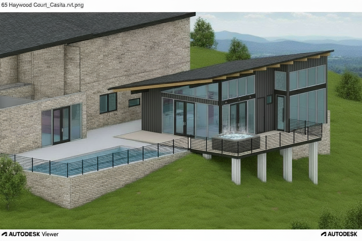 render this as an actual photo change the color of the deck where the hot tub sits to white oak wood panels on the left side second story of the main building add in an upper patio add windows to the second story of the main house
