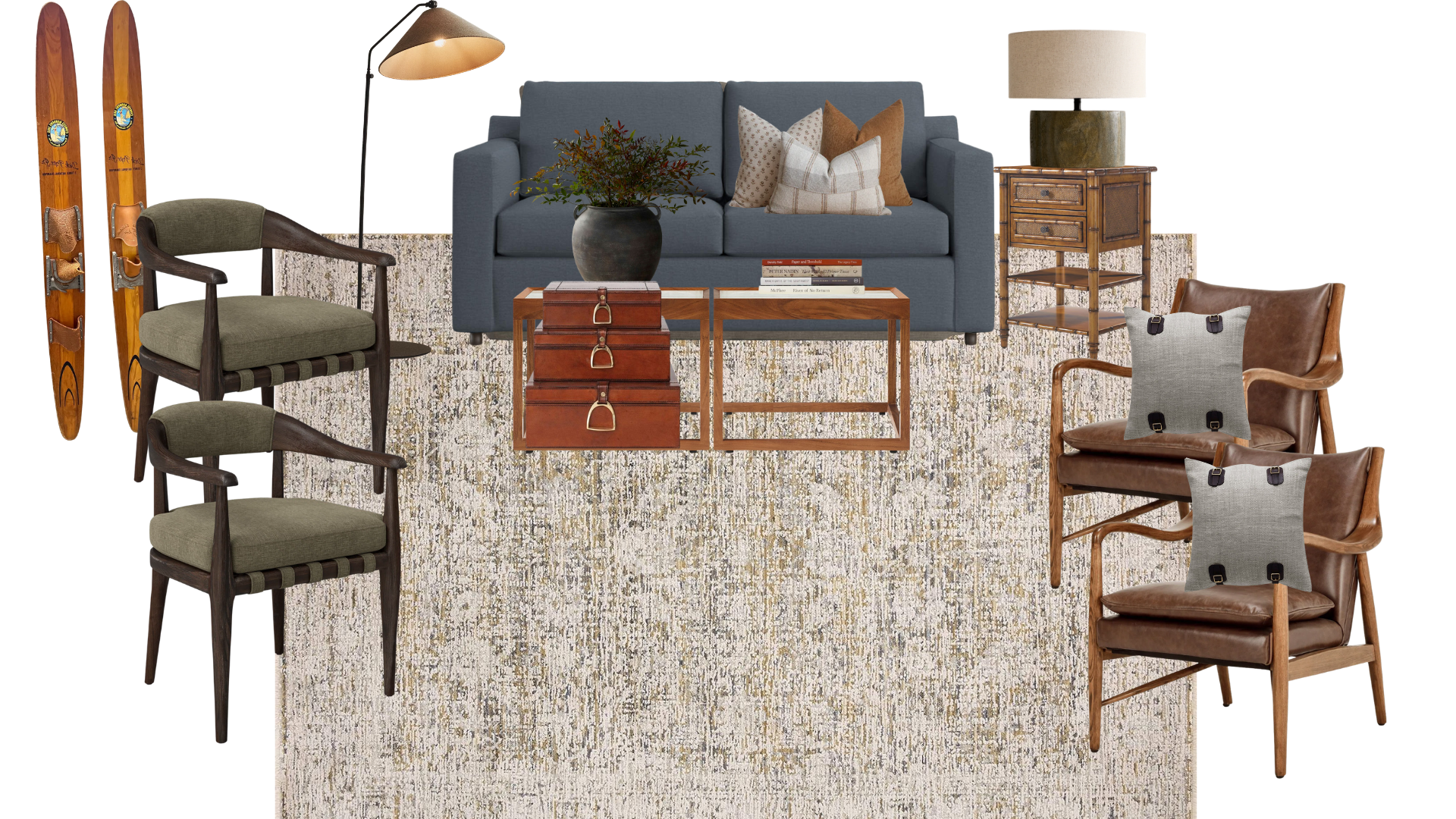 create a moodboard that is professional looking with the items on this moodboard you can label the items in a small light font with arrows only put the label one time even if there are 2 of the same items the skis are vintage wooden water skis