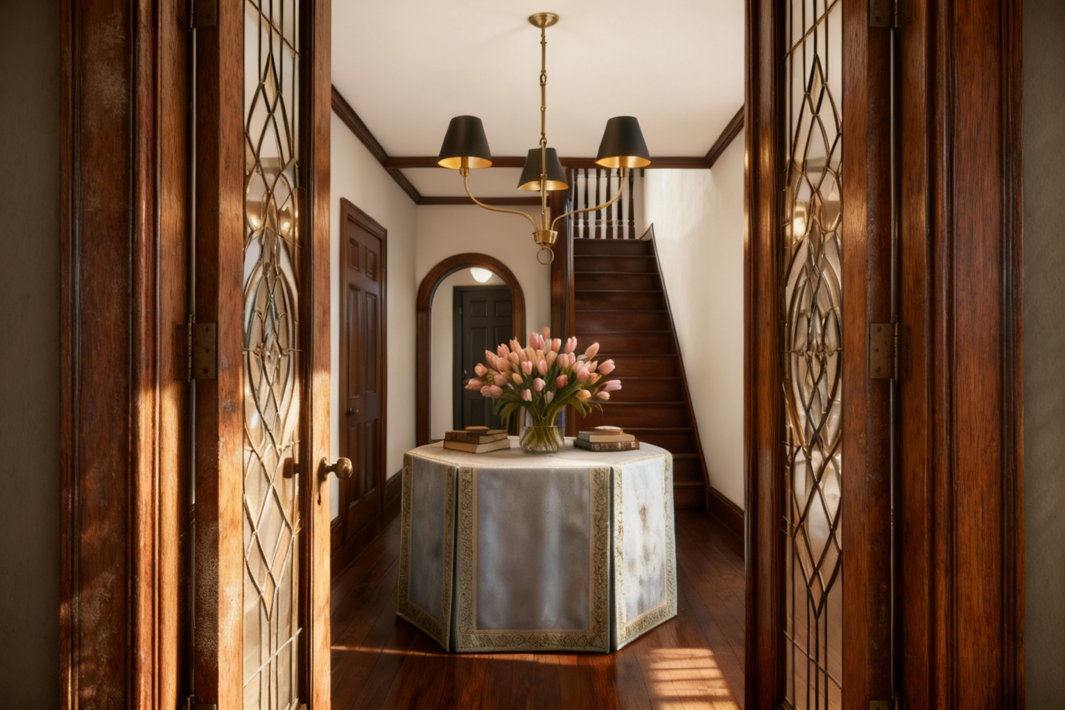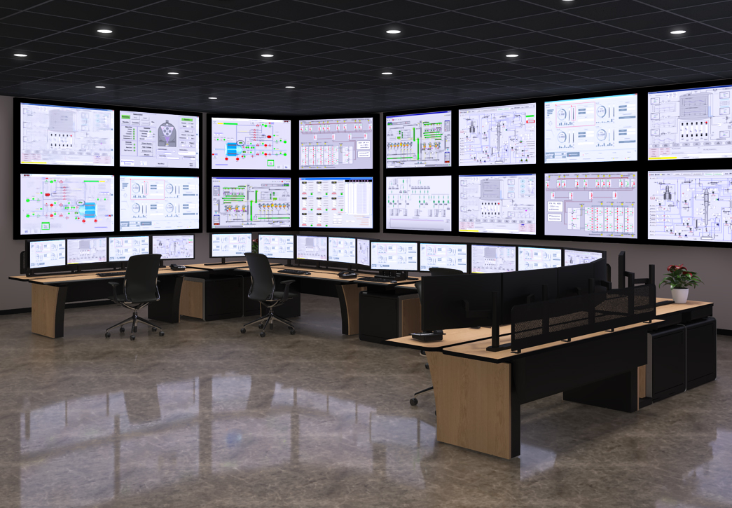 keep all geometry and finishes in place add photorealistic people to the scene two sitting at chairs and one standing in the middle of the room holding a clipboard add reflections and shadows of the people to the floor as necessary to show that they are in the scene enhance the lighting using the screens and light fixtures as seen in the image