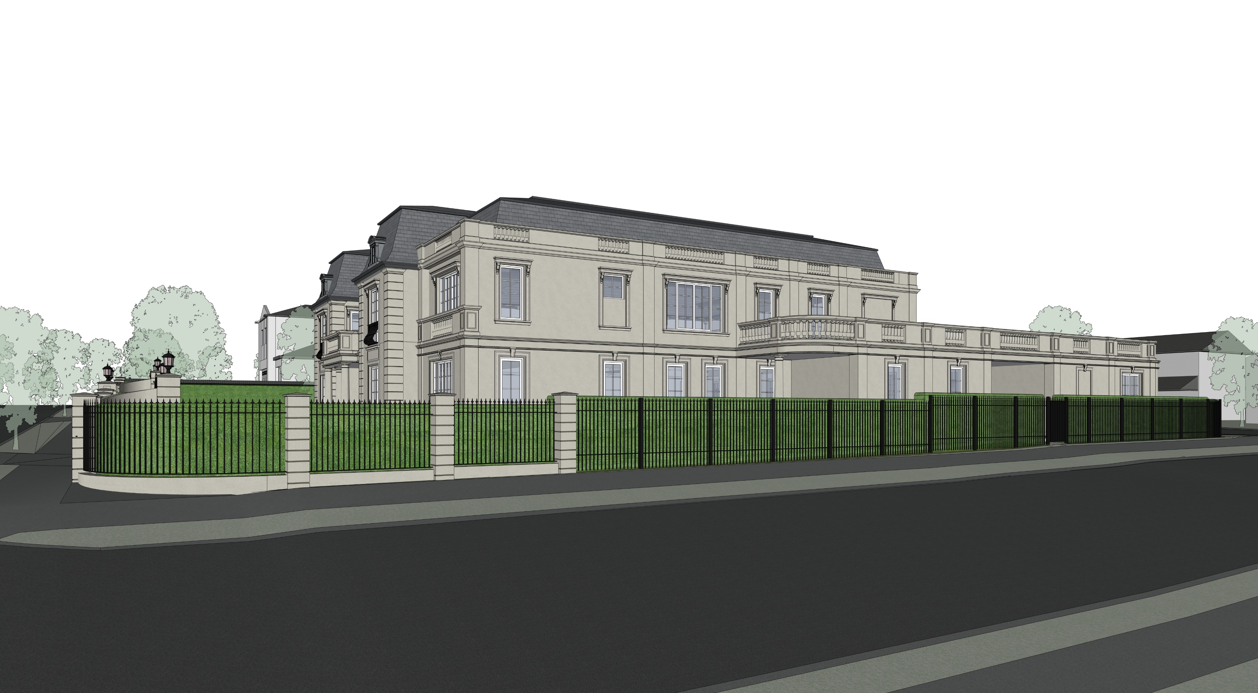 photorealistic render canon eos 5d classical home high green hedges fence dramatic lighting award winning at dusk contrast slate roofing wet road diffused light on the curated objects within which reflect a blend of natural textures the composition should be balanced and serene evoking a sense of high end artistry with subtle reflections of the internal light the overall image should be sharp exquisite detail from the texture of the building materials to the softness of the light glow