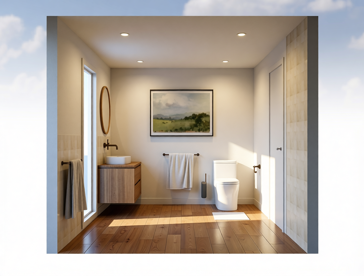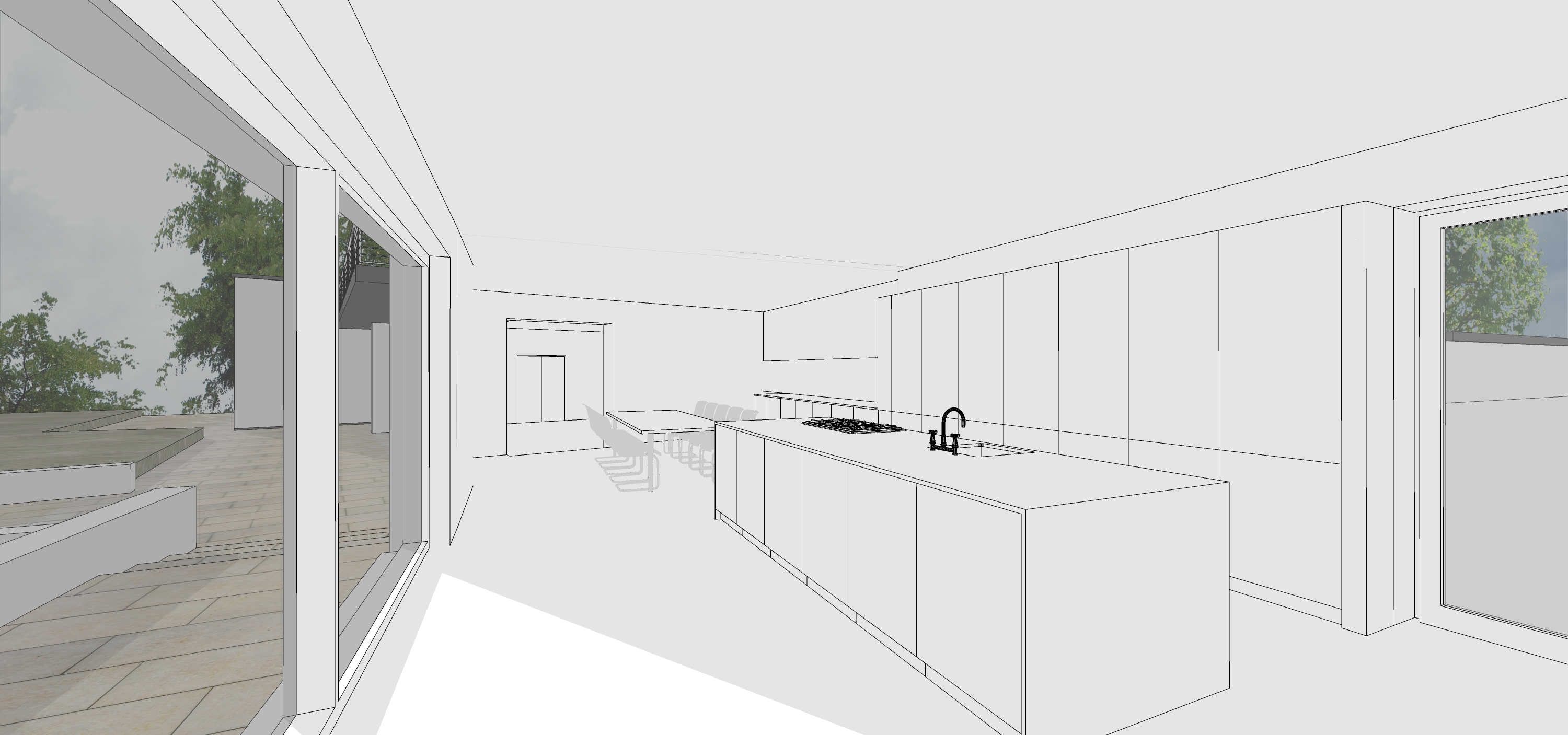this is the kitchen of an elegant modernist house that we want to renovate the floor is beige burgundy stone the window frames are anthracite black and to the left of the window is a glass fronted cabinet the cupboards are finished in white we want to create a bright natural atmosphere with plenty of light adding a touch of life through the window to the left we can see a large garden and beyond it a glimpse of the living room at the end of the view through the sliding door we see the living room