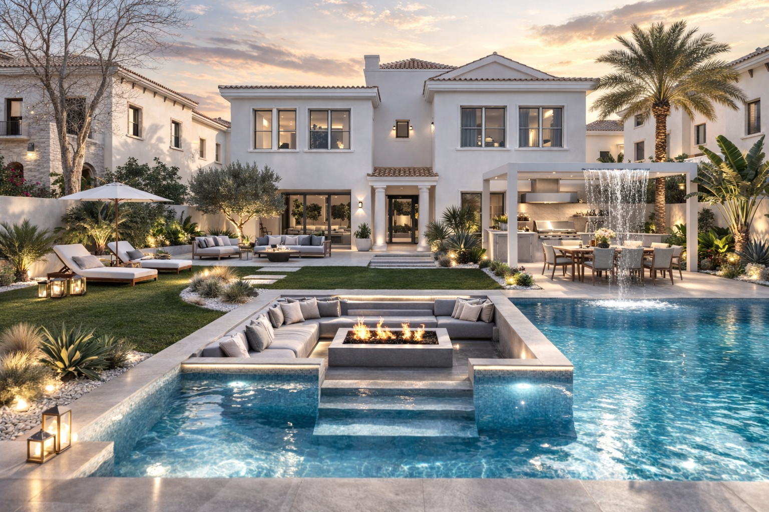 enhance this image to achieve maximum photorealism while preserving the exact architectural design do not modify the architecture pool shape fire pit pergola furniture layout landscaping surrounding houses materials proportions or scale no redesign no added or removed elements improve realism through physically accurate lighting and material behavior use natural daylight tones with correct shadow softness and balanced contrast ensure materials respond to light realistically accurate reflections on glass and water subtle texture visibility natural surface roughness no over polished or artificial shine water should look physically accurate realistic reflections subtle surface movement no exaggerated sparkle or glow avoid dramatic color grading avoid oversaturation avoid artificial cinematic effects the final result should look like a high resolution photograph taken on site with a professional camera photorealistic natural architecturally precise