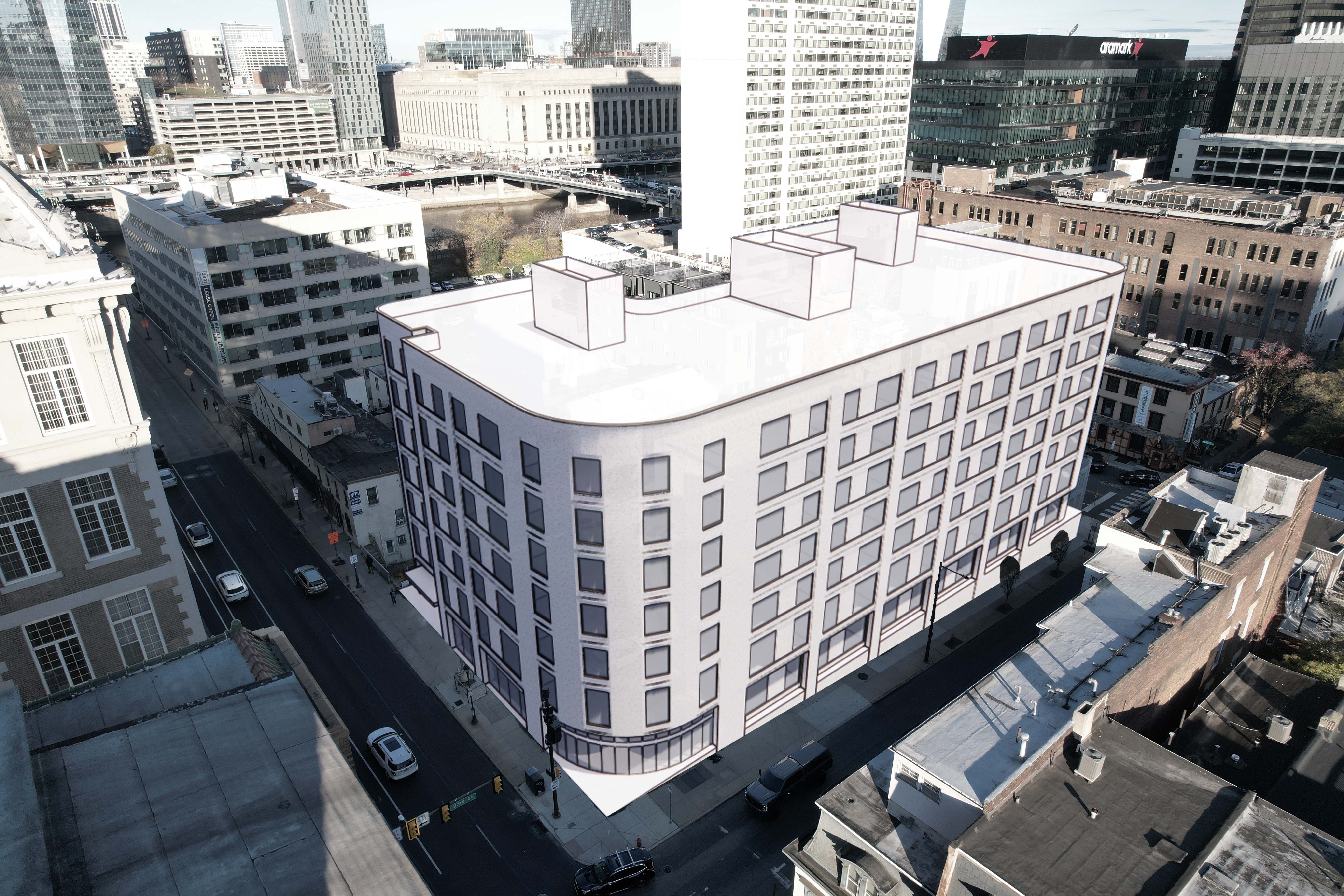 produce rendering of a dark red brick building with contemporary brick detailing all lintels and sills should also be solider course dark red brick windows should be dark bronze industrial style transition material to vertical white siding at interior courtyard provide green sedum roof top penthouses at roof should be vertical white siding