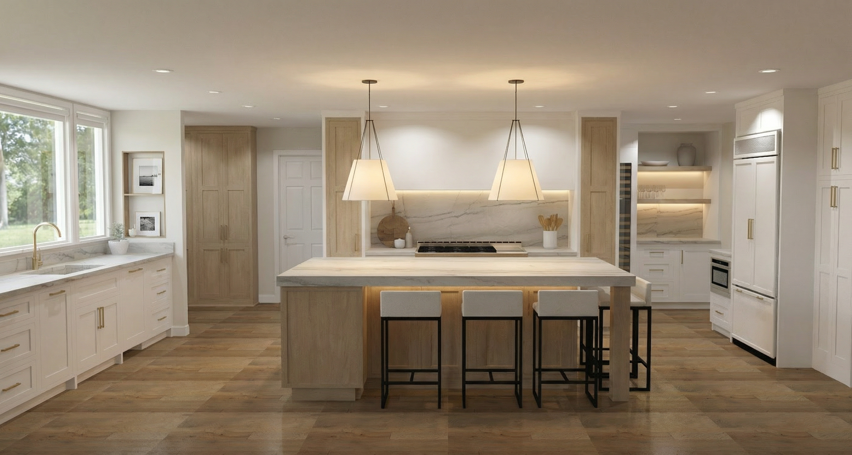 add a pendant light above island and stools for sitting