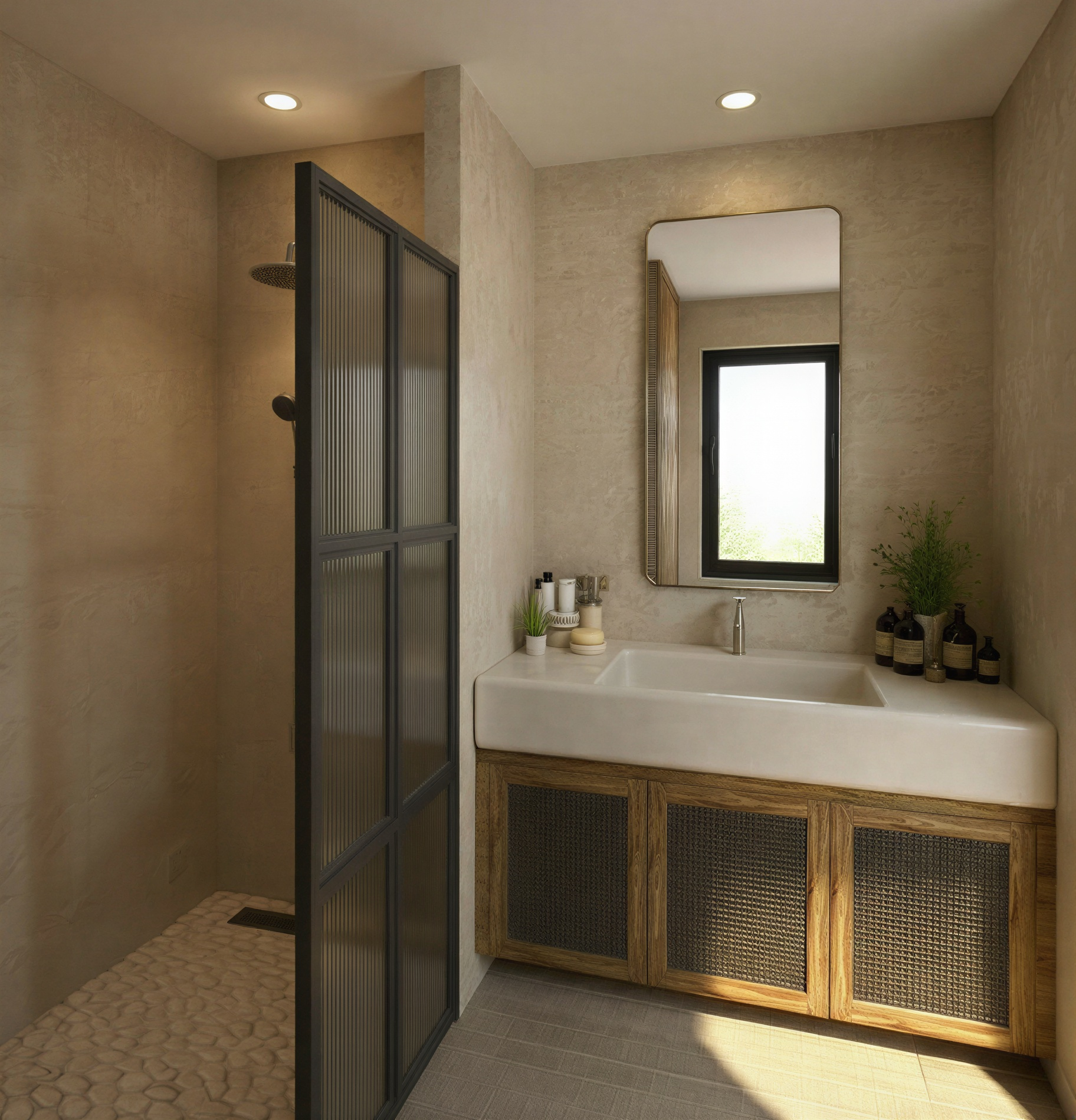 an amorphus mirror with fluid irregular organic shape soft surface and sculptural look minimalistic modern let the wall continue behind the mirror dont add any material behind it u can change the form of the window make it more curved version