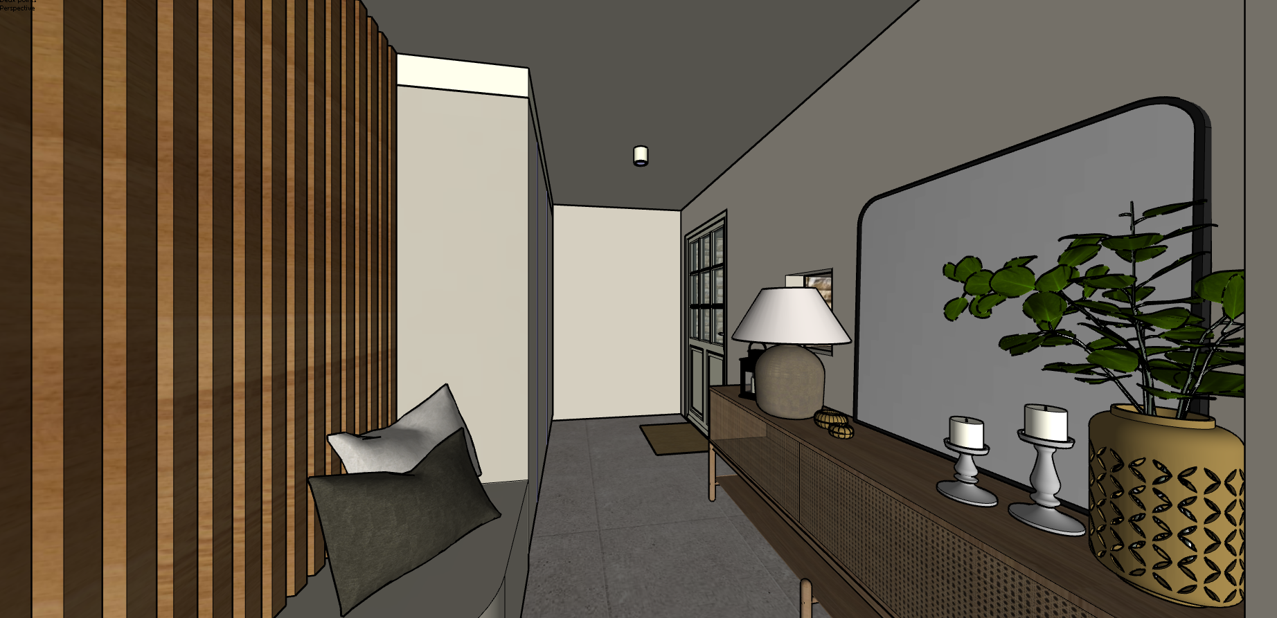 transform this sketchup model into a photorealistic architectural render keep the exact geometry proportions and layout and colors of the model materials realistic textures with natural imperfections wood grain stone texture matte paint lighting soft natural daylight coming from windows global illumination realistic shadows style high end contemporary interior design elegant and warm atmosphere add subtle details realistic reflections natural light bounce depth of field slight ambient occlusion camera architectural photography style wide angle 24mm eye level perspective render quality ultra realistic high resolution physically accurate lighting professional architectural visualization