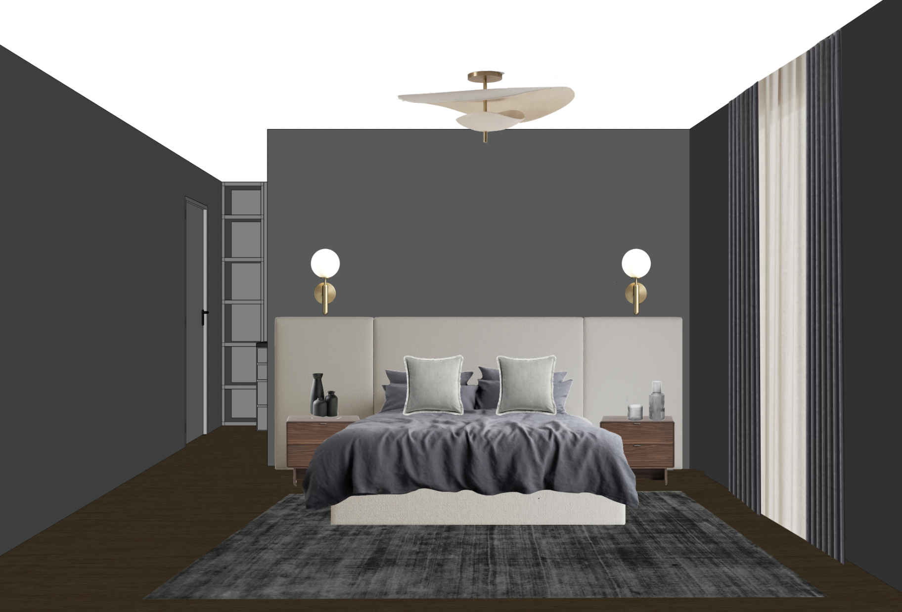 render my image make the bedframe a medium grey add light source to wall sconce and ceiling light walls are dark grey bedding is dark grey linen add bedspread to the bed add light source to ceiling light add folded clothes to shelves in the back room keep rug the same
