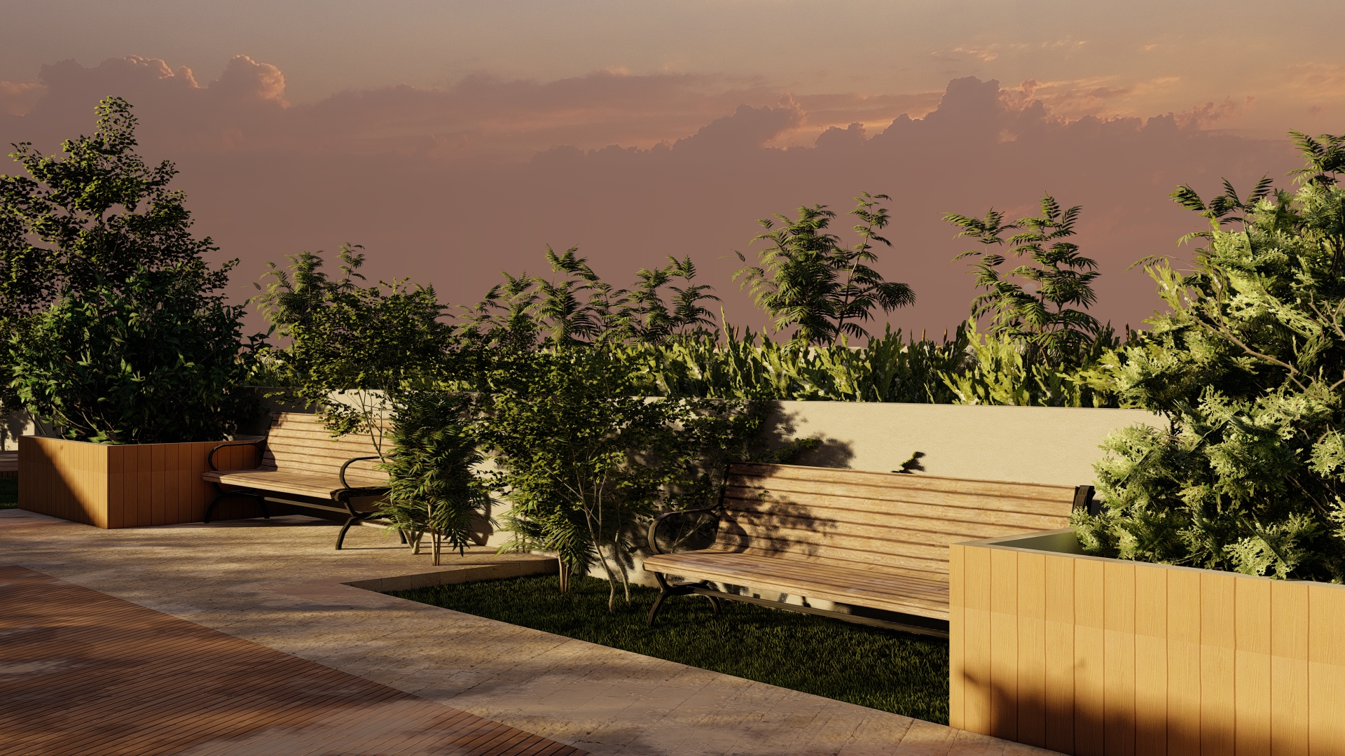 sunset lighting modern contemporary materials in warm gray and cream tones improve plants with more variation of tropical plants wood slats in the facade brick flooring in warm beige cinematic photorealistic 4k resolution 35mm camera lens