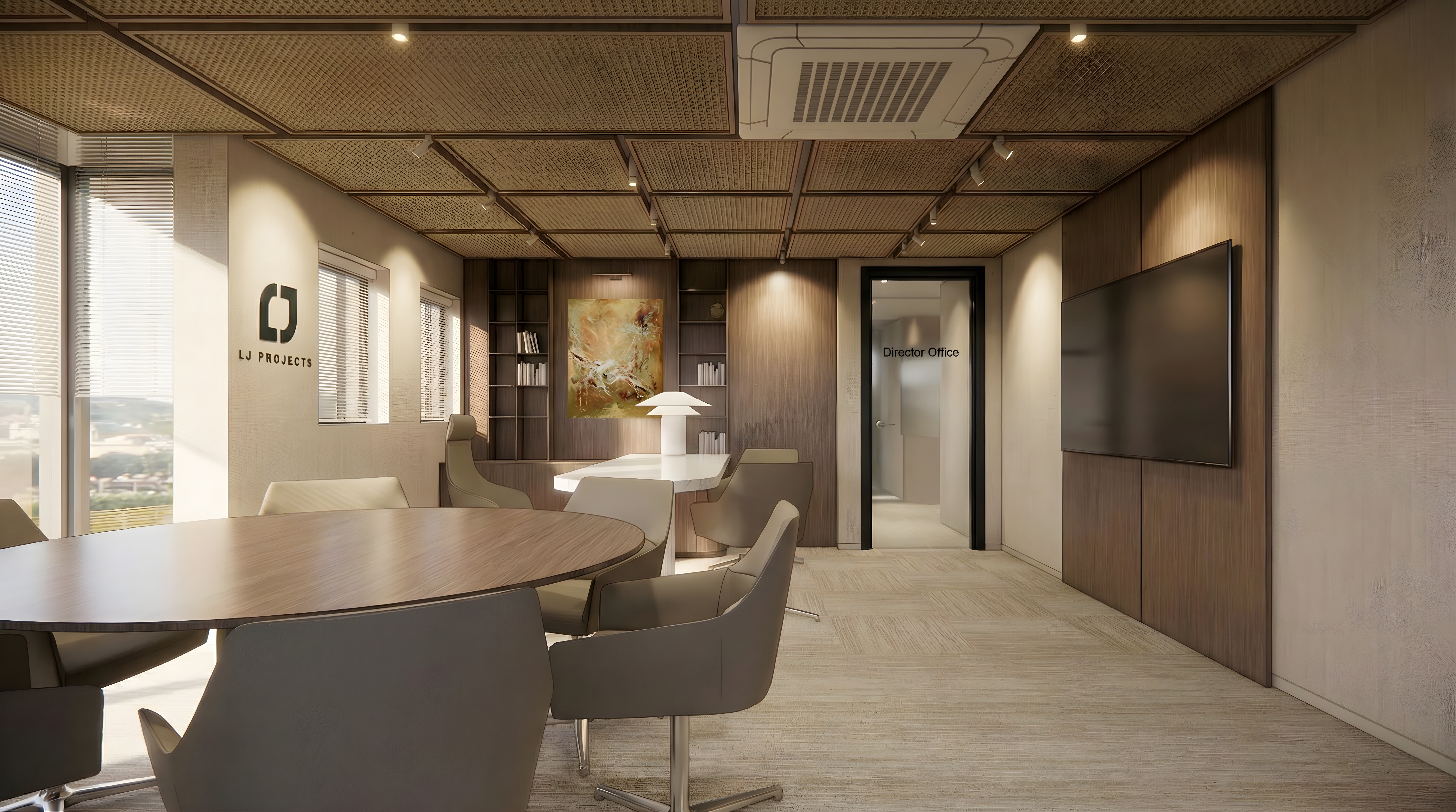 interior shot enhance this image into a hyper realistic 3d render while keeping all geometry shapes proportions furniture layout and design elements exactly the same do not alter the architecture or reposition anything only improve materials textures lighting and realism material texture enhancements add high resolution pbr textures to all surfaces linen wallpaper enhance the beige linen walls with visible woven fiber texture soft shadows and natural light absorption wood panels cabinetry add rich wood grain depth micro roughness subtle tonal variation and realistic soft reflections tables round table enhance wood grain matte finish micro detail marble table sharpen veining add depth polished highlights natural reflectivity chairs add realistic leather texture stitching definition soft creasing and correct light interaction bookshelves sharpen edges and materials add shadow depth and realistic shelf texture ceiling panels add lifelike woven texture with depth shadow separation and natural imperfections carpet add fine fiber detail directional pile micro shadows and photoreal softness glass door refine clarity reflections and edge highlights lighting improvements increase and soften natural daylight coming from the windows creating realistic warm highlights across the room add subtle global illumination ambient occlusion contact shadows and accurate shadow gradients maintain existing artificial lights but improve their realism with soft warm pools of light render quality ultra sharp details crisp edges realistic materials enhance reflections refractions and subtle imperfections for photoreal quality maintain camera angle composition and all object placements exactly as in the original image the final output should look like a high end professionally rendered interior visualization with full photoreal textures and perfect lighting