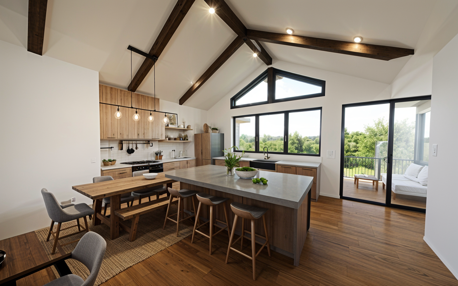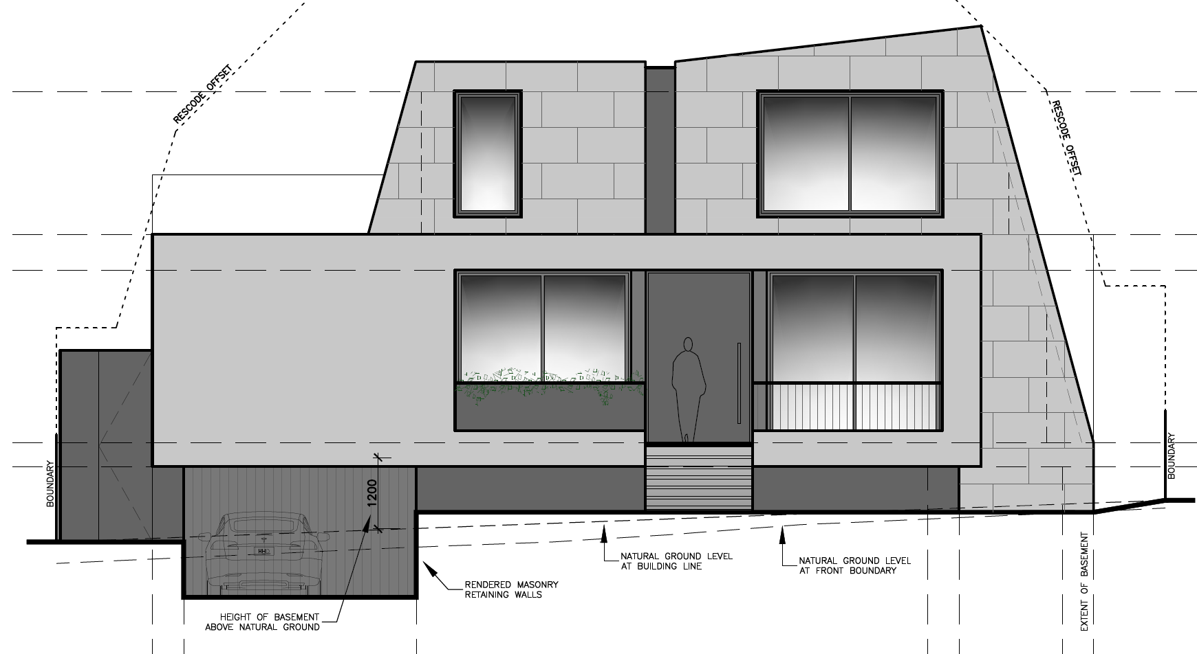 render this modern house as described with the entire ground floor and second storey front frame in warm grey off form in situ concrete with deep reveals and crisp shadow gaps the top storey pavilion in a dark steel vertical cladding dark bronze window frames and railings and keep the neighbouring houses exactly as existing white massing