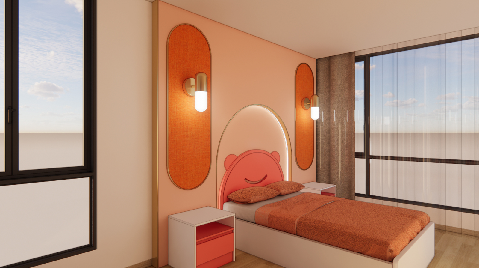 add forested background outside the window to the right add another house in the background outside the window to the left