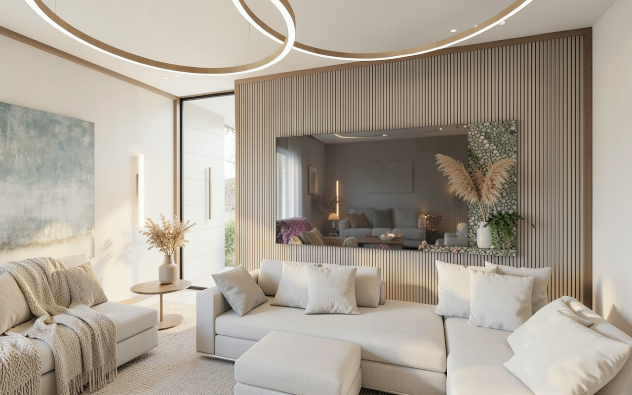keep same geometry more realistic lighting and materials bathroom of a luxury summer villa the wall are tiles dimension 0 60m 1 20m with stone feeling add hidden led lights below bench and mirror the pots are gun metal color inside shower keep the same 3d tile but more beige tone