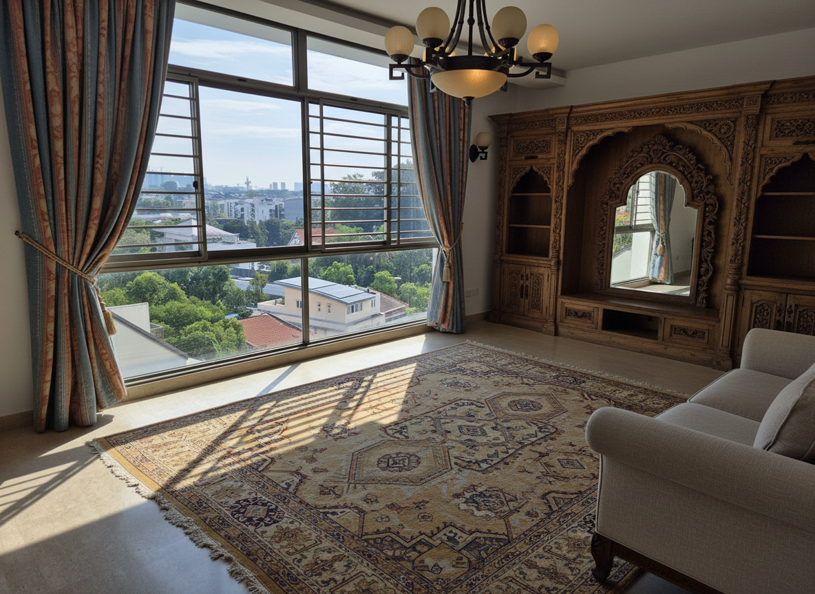 a modern minimalistic interior hallway with a sleek elegant design the walls are a soft light gray providing a calm and neutral backdrop a textured gray wall section complements the cozy built in nook the floor is tiled with large light beige stone tiles adding warmth to the room a smooth light wood staircase ascends upwards its clean lines enhanced by gentle lighting there is a simple abstract black and white painting on the wall adding artistic flair the black framed glass door at the back offers a glimpse into a serene softly lit space beyond creating an open and airy atmosphere the overall ambiance is calm sophisticated and inviting with subtle contrasts and a harmonious color palette of gray beige black and white