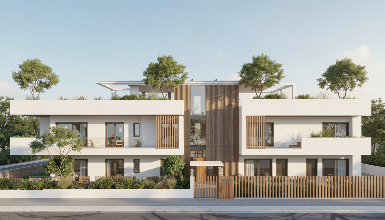 new urbanism exterior shot modern architectural building with a sleek design featuring bold use of red brick for the walls contrasted with clean white and silver metal accents the structure should be rendered under a clear blue sky basked in warm golden hour sunlight for a soft inviting glow the atmosphere should be calm and sophisticated with subtle shadows highlighting the building s geometric features lush greenery around the base to enhance the serenity and grandeur of its appearance double roof architecture