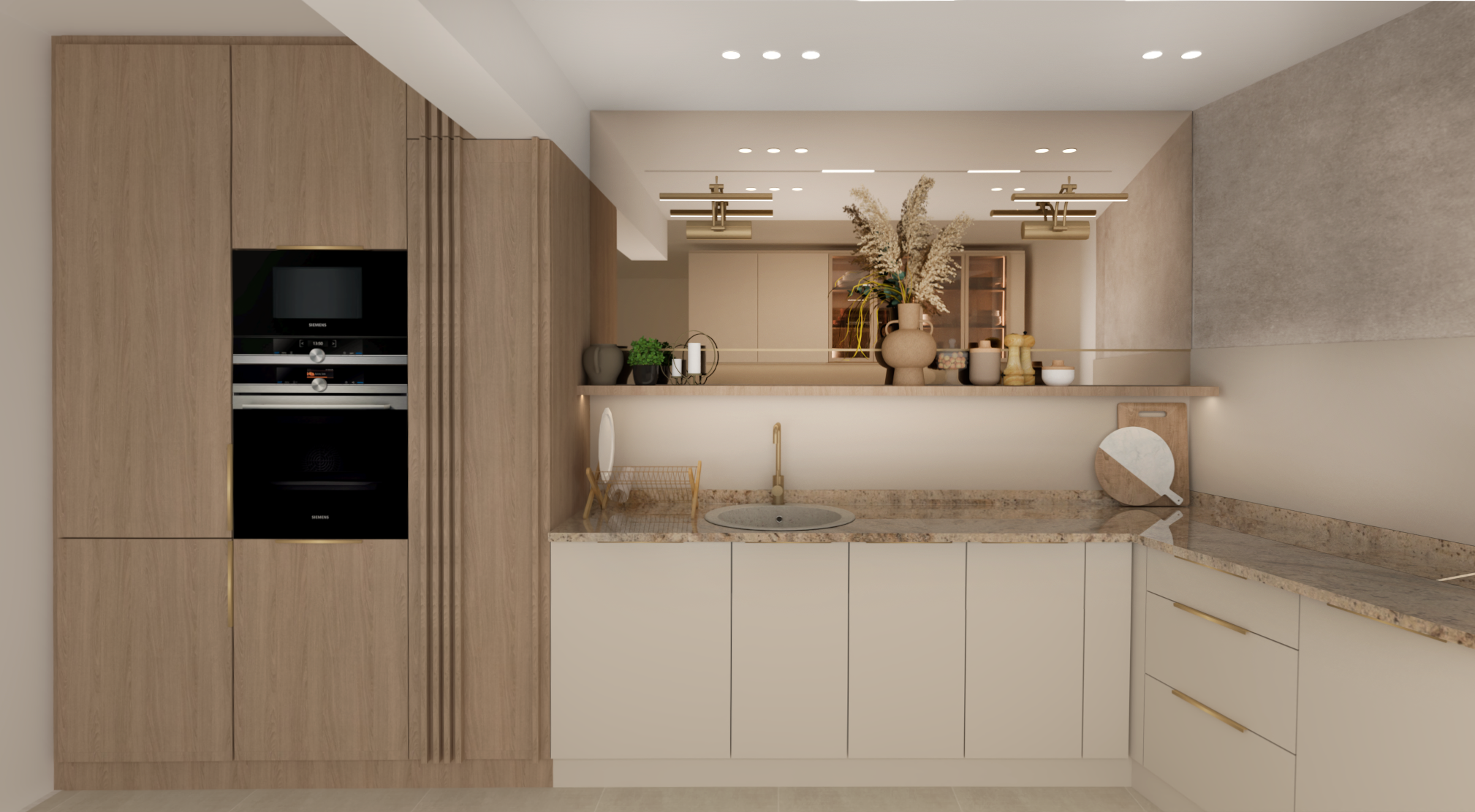 maintan colors create foto realistic image do not add anything mirror bronze light artificial from cealin downlighter only this room do not have windows