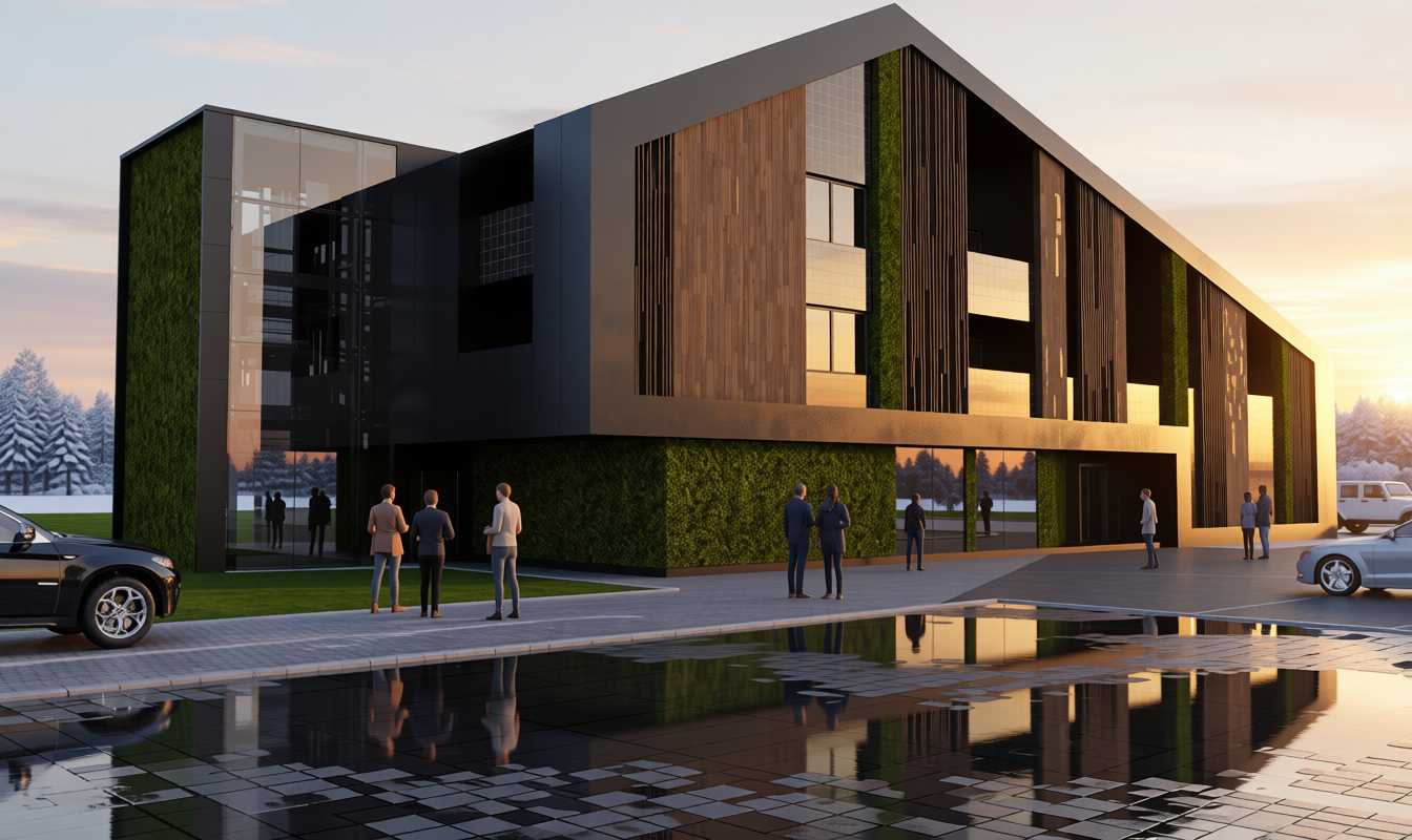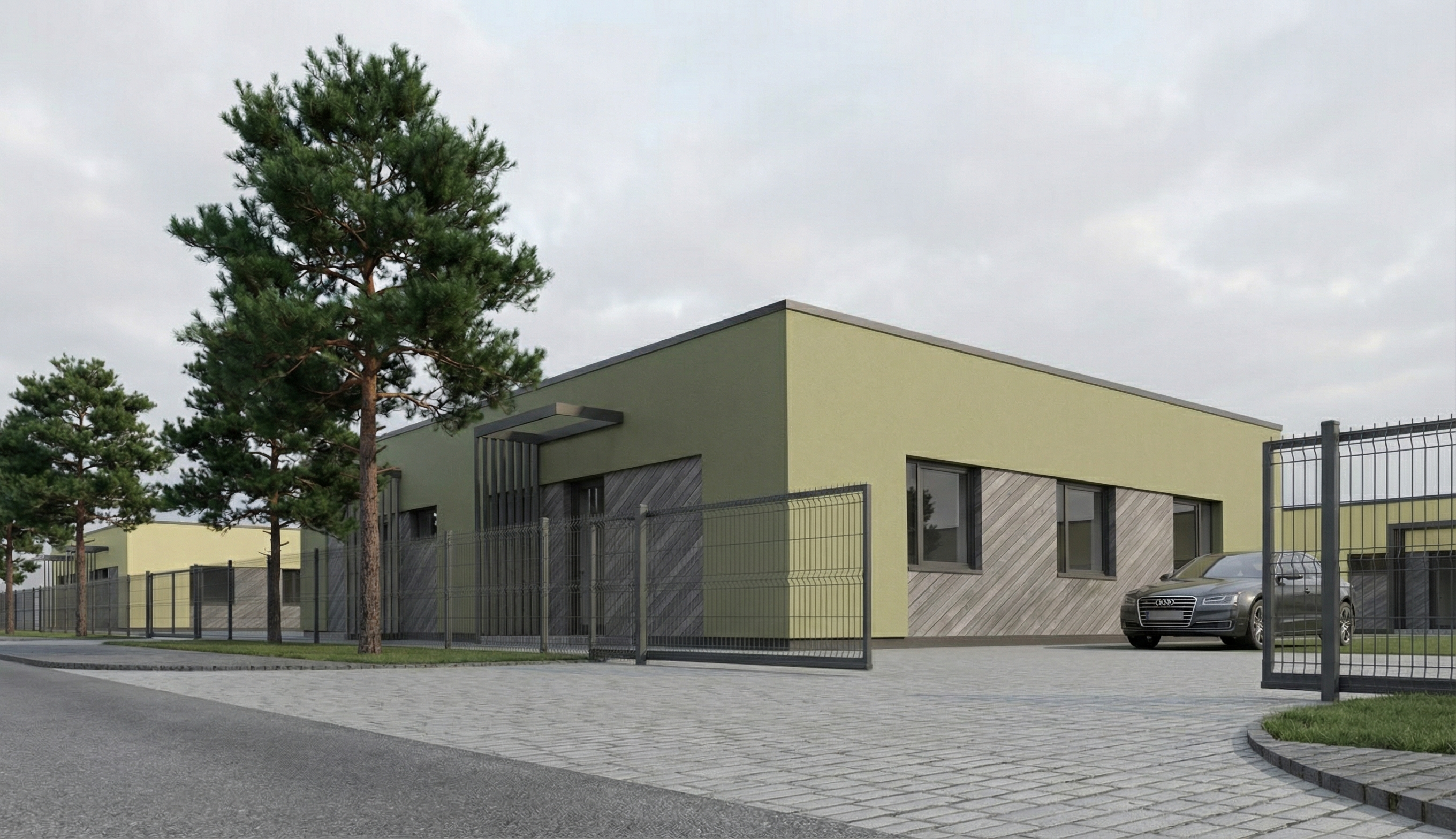 this house has a glass pivot front door the double section garage door is black in colour the is charcoal colorbond roof sheeting the front facade is plastered please add grass infront of the house with a big tree on the right hand side of the paved driveway remove the window on the right hand side bring the house in on the right hand side in line with the front right corner the house has a small porch area infront of the window move the tree closer to the middle of the grass