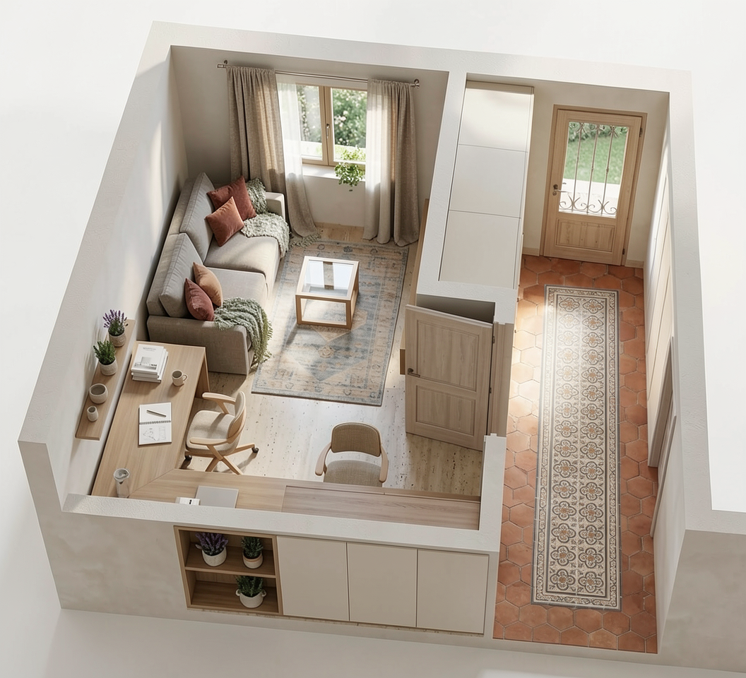 a modern bathroom design white travertine flooring complements a light walnut vanity with full length walnut pulls the fixtures are stainless steel and the faucet is graphite or luxe steel the mirror reflects the smooth flat panel white door there is no natural light in the room so it s more moody