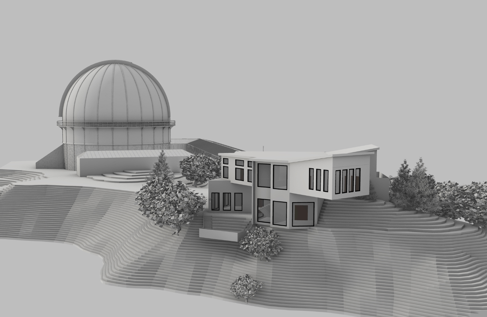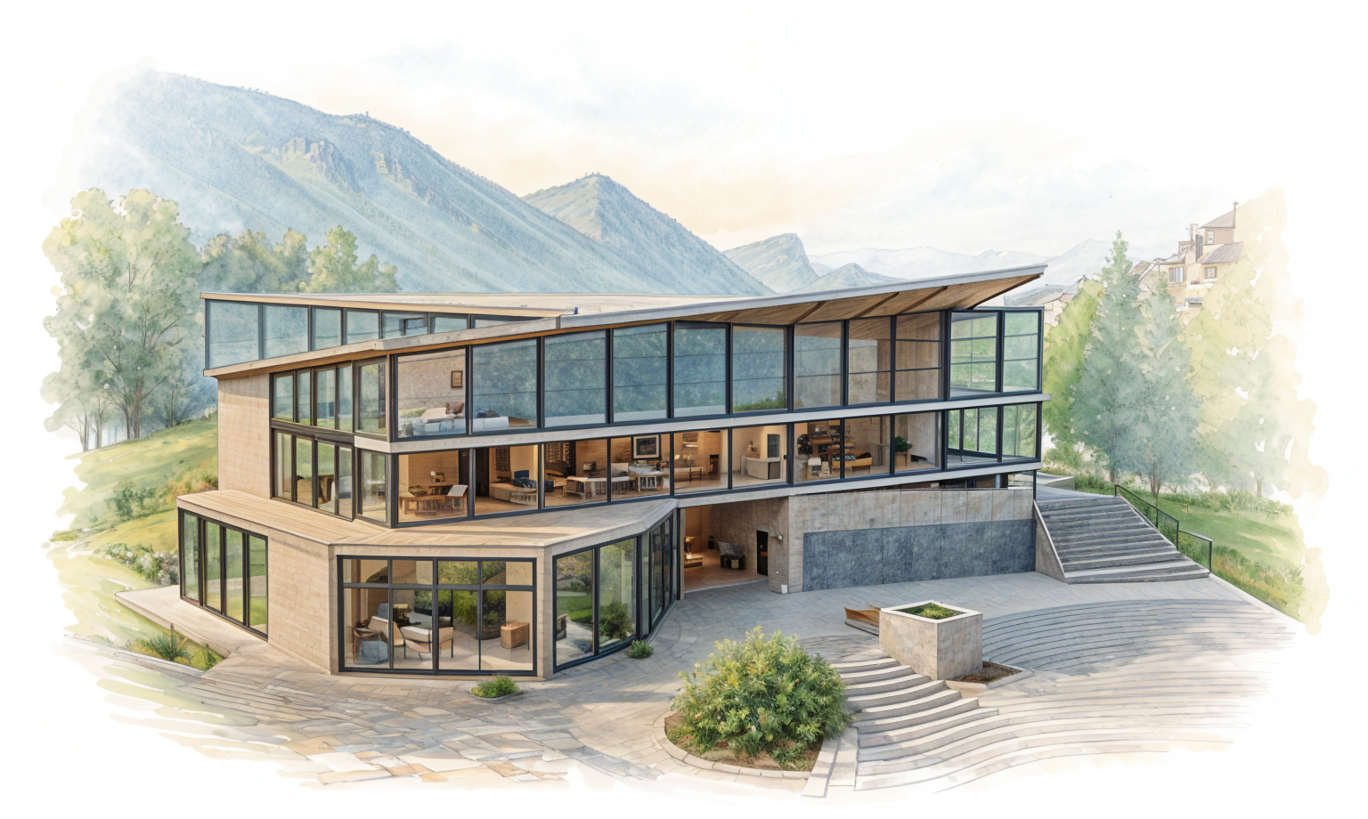 architectural watercolor rendering of a small contemporary research station perched on a rocky cliff structure made of warm wood black steel and glass precise and realistic architectural detailing cantilevered over stone terrain supported by steel beams surrounded by mountain pines and mist below rendered with crisp building geometry and realistic materials background and edges dissolve into loose watercolor washes and white paper edges not full bleed with soft unfinished fade around the image visible pencil and ink linework with light technical annotations artistic yet grounded balance of precision and painterly abstraction calm morning light concept architectural visualization style