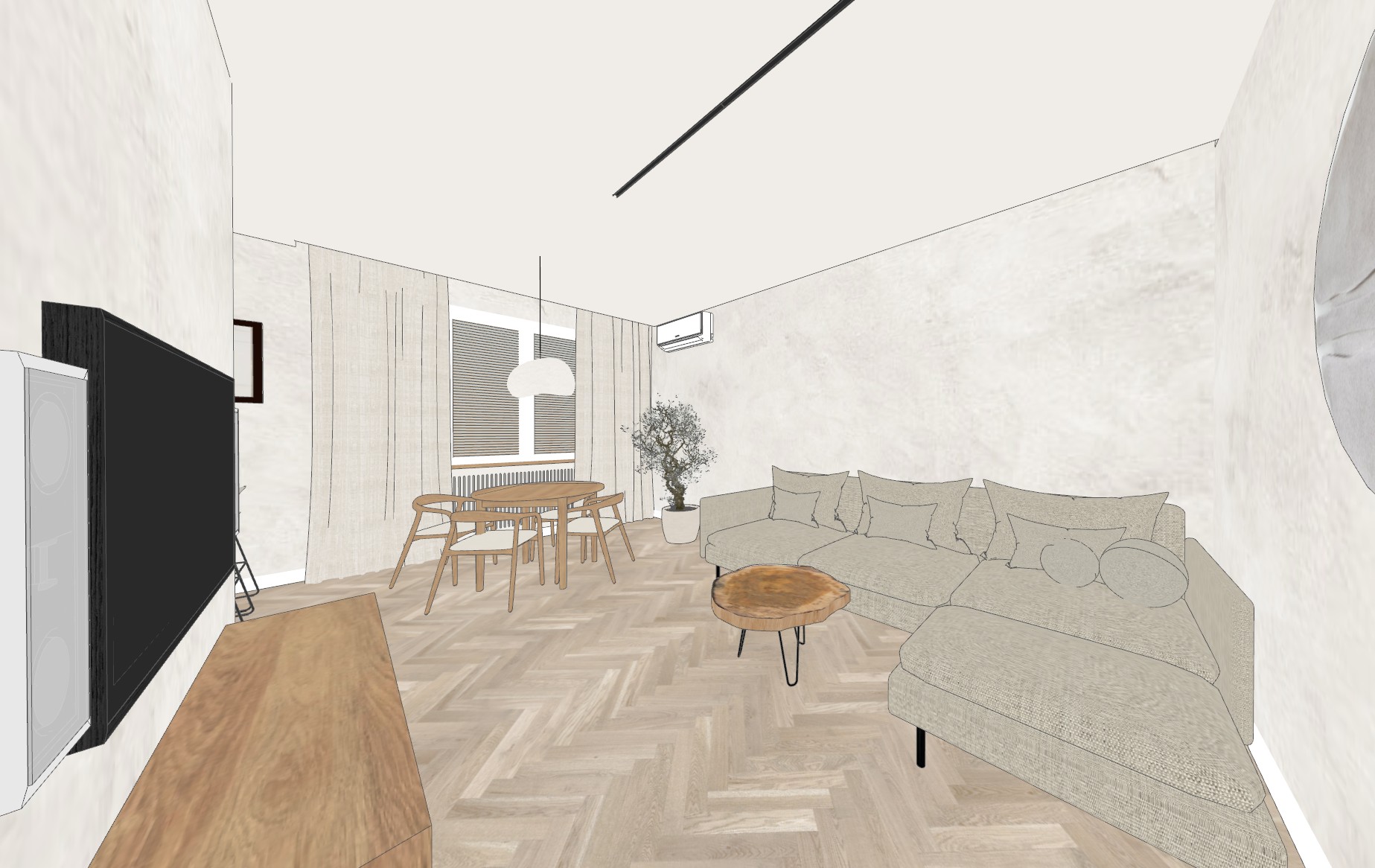 make relistic interior render warm natural materials microcement beige off white on the walls japandi style minimalistic
