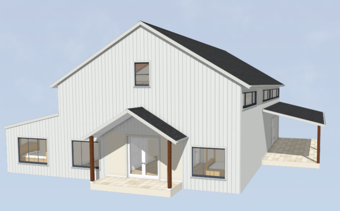 modernist exterior shot transform this architectural sketch into a high end photorealistic australian barn style home design style modern barn farmhouse with strong rural australian character architecture simple barn form gabled roof dormer windows where appropriate wide wrap around verandahs strong symmetry timeless proportions materials colorbond standing seam metal roof charcoal or black vertical timber cladding mixed with board and batten natural stone base accents timber posts and beams large black framed windows setting australian outback rural farm landscape rolling paddocks fencing open fields subtle hills native trees warm dry grass tones lighting golden hour sunset warm internal lights glowing through windows cinematic soft shadows mood calm elevated rural luxury timeless grounded aspirational camera wide angle aerial or eye level architectural photography shallow depth of field ultra realistic quality ultra high resolution architectural visualization magazine quality realism avoid suburban streets modern city homes glossy interiors excessive glass boxes unrealistic materials australian rural context colorbond finishes bushland adjacent farmland understated luxury not american farmhouse not hamptons make this a white version wider roof panelling make the deck a tiled alfresco make the roof pitch higher light up the internal rooms no brickwork architecture