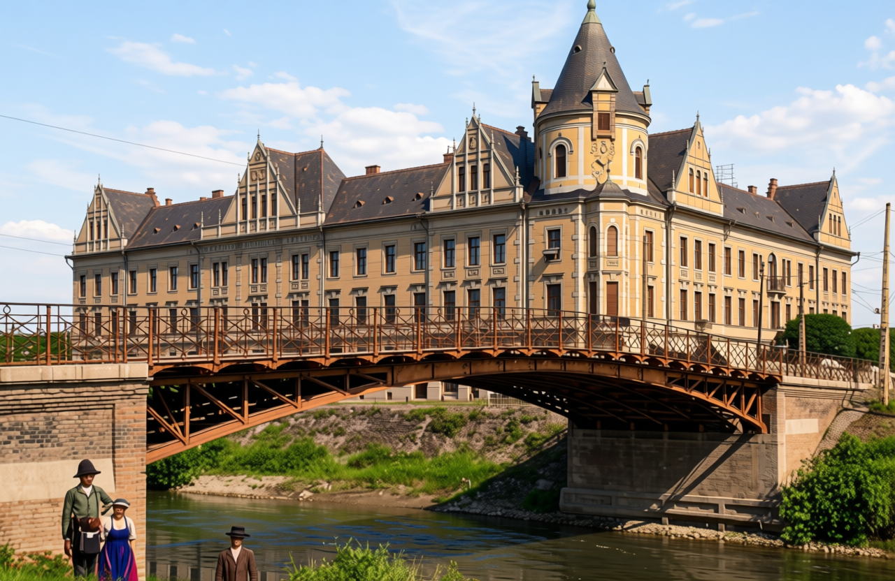 remove text from the top of picture put people on the ground flat river under the bridge